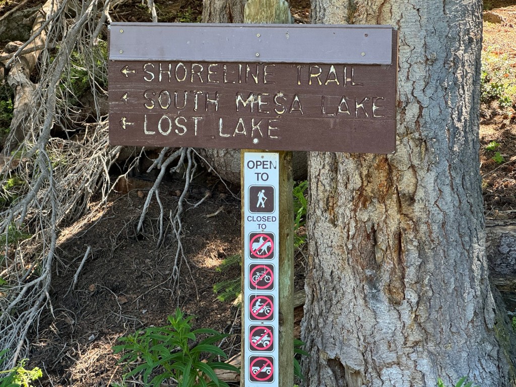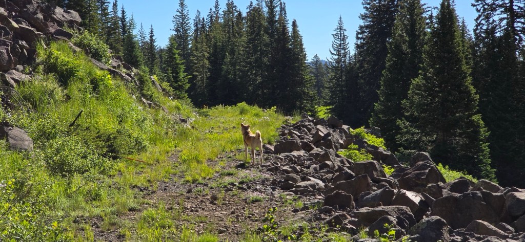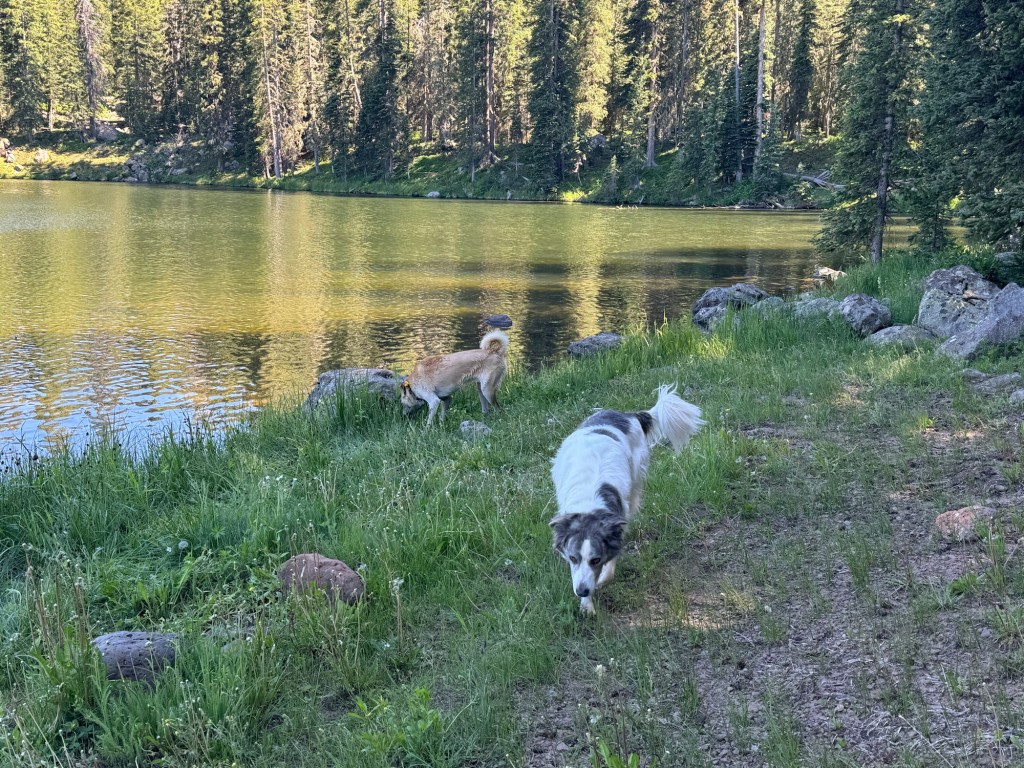 As we made our way to Lost Lake, we passed South Mesa Lake, a quiet and beautiful spot where we saw a yellow-bellied marmot sunning on the rocks. Although we couldn’t linger for long, we were enchanted by the tranquility of the scene. Finally, we reached Lost Lake, which provided a more secluded experience with its pristine blue-green waters. The dogs enjoyed swimming while I dipped my feet in the cool mountain waters, relishing the serene moment.