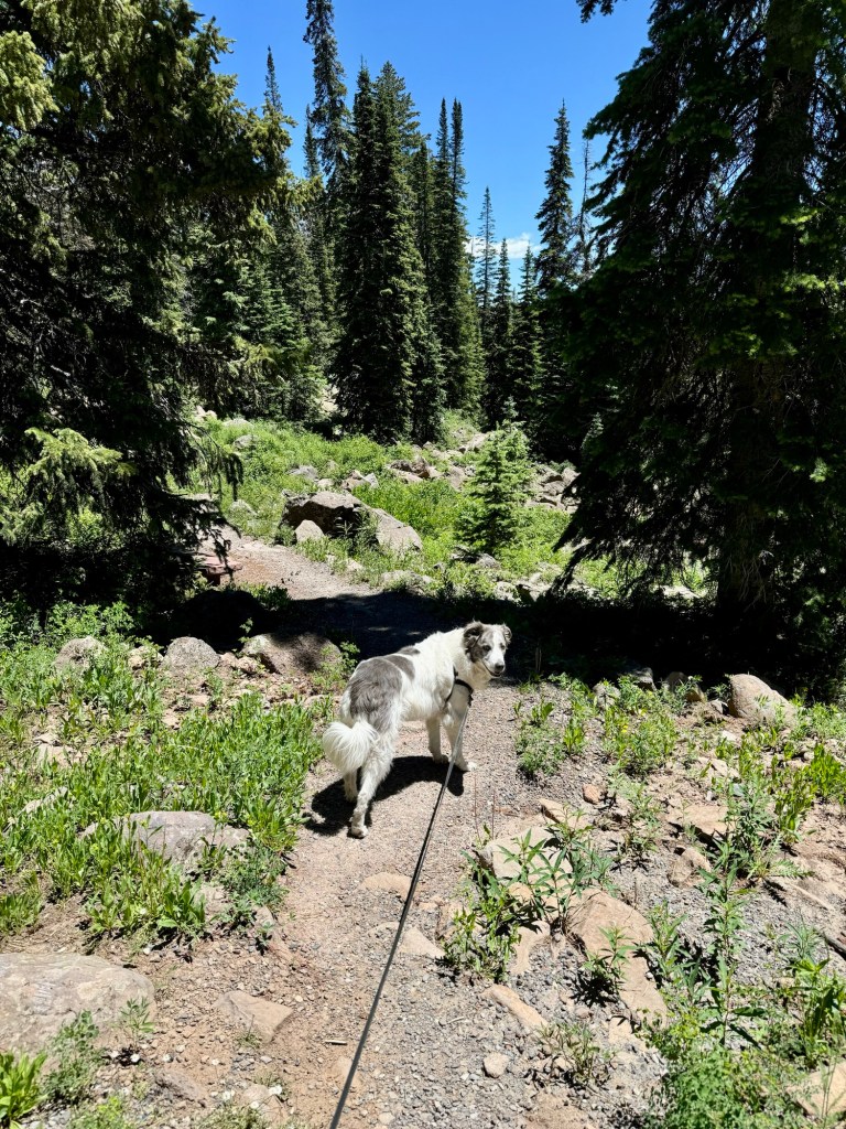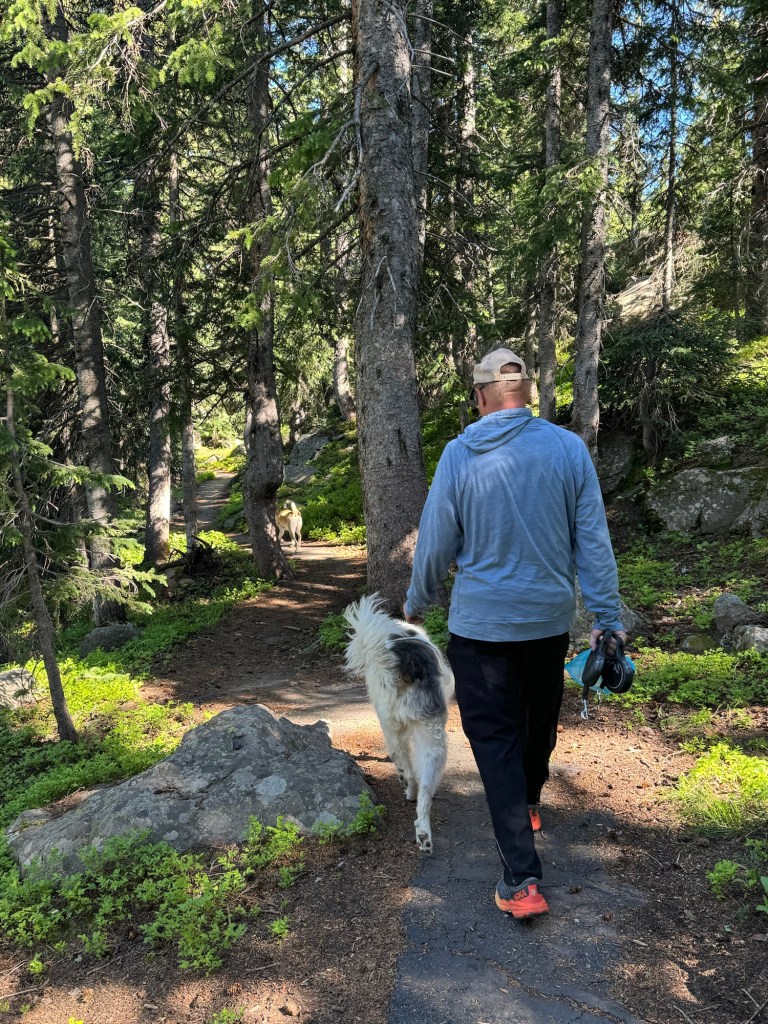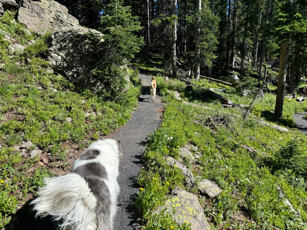 While the guys spent the morning fishing, Lennon and I ventured out to explore the trails around Island Lake. In the afternoon, we all headed to the Land of Lakes Overlook. The dogs were thrilled, scampering eagerly up the trail. This short hike (0.5 miles round trip) led us to a breathtaking rim with a panoramic view of the stunning landscape. From this scenic viewpoint, we marveled at the numerous lakes reflecting the clear blue sky, all framed by lush forests. In the distance, we could see the Elk and San Juan mountain ranges and the Black Canyon of the Gunnison, making the vista even more awe-inspiring.