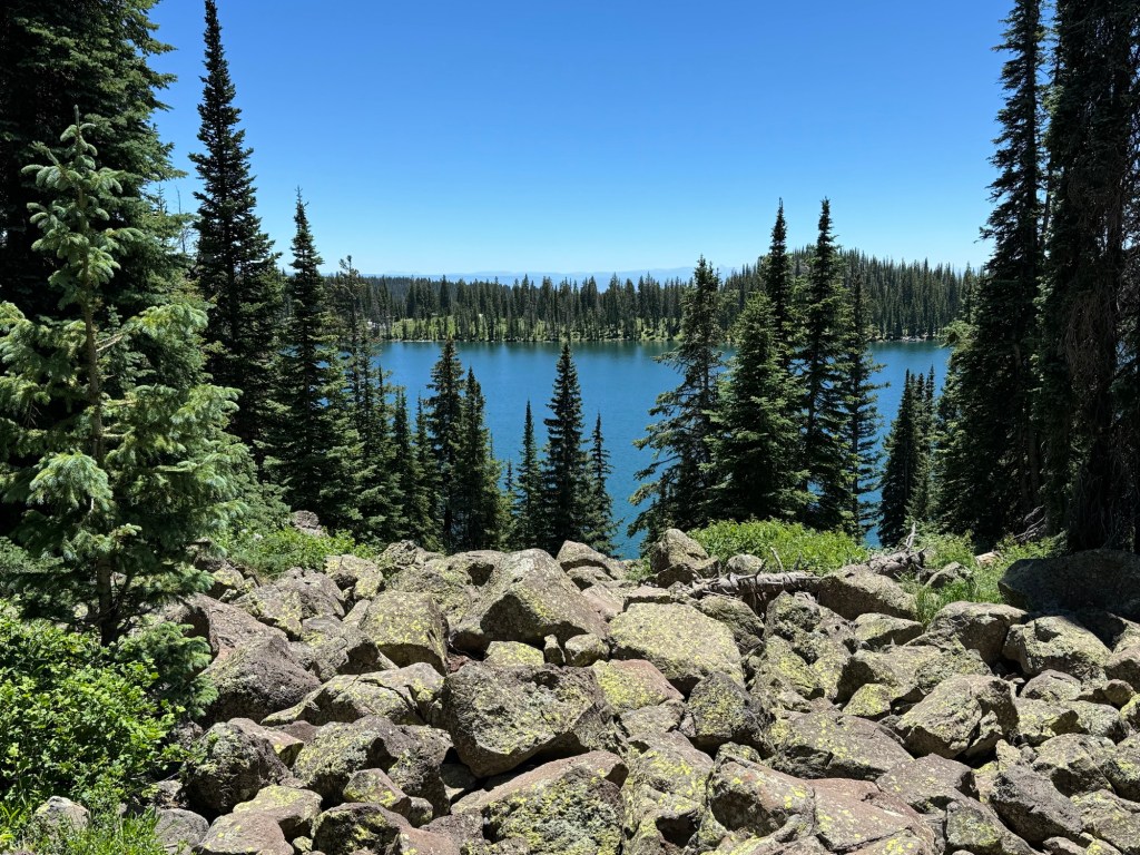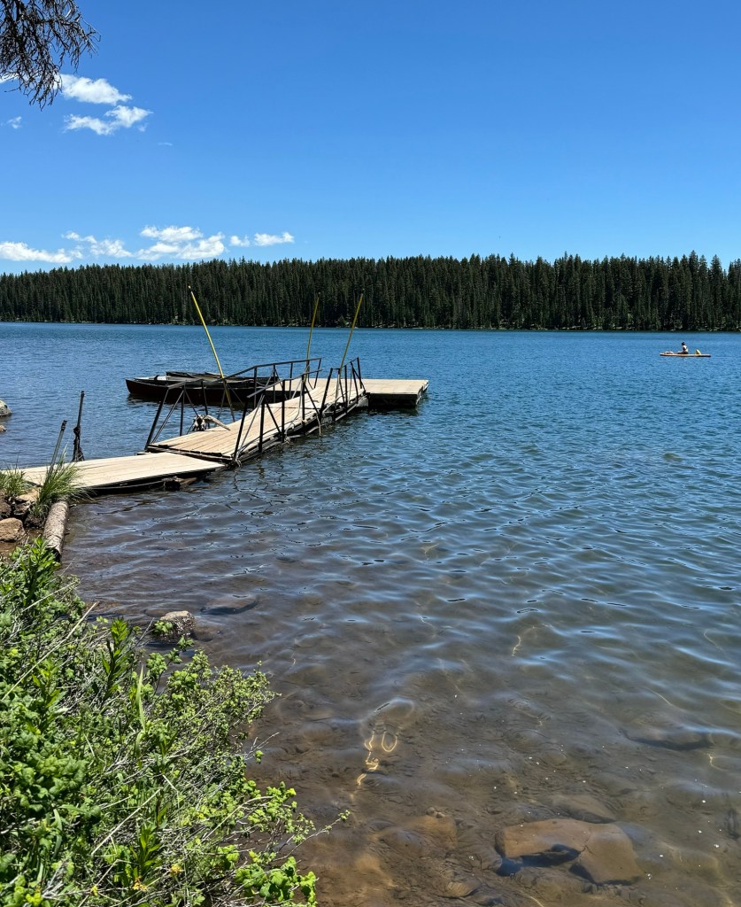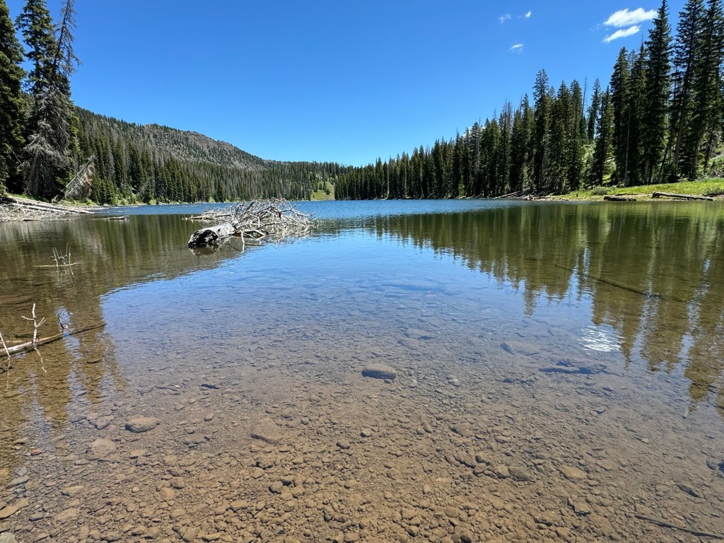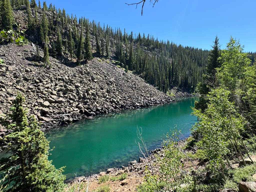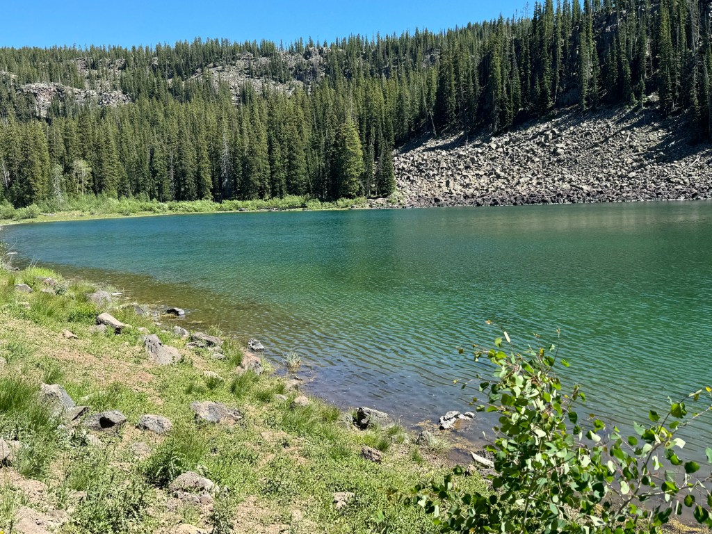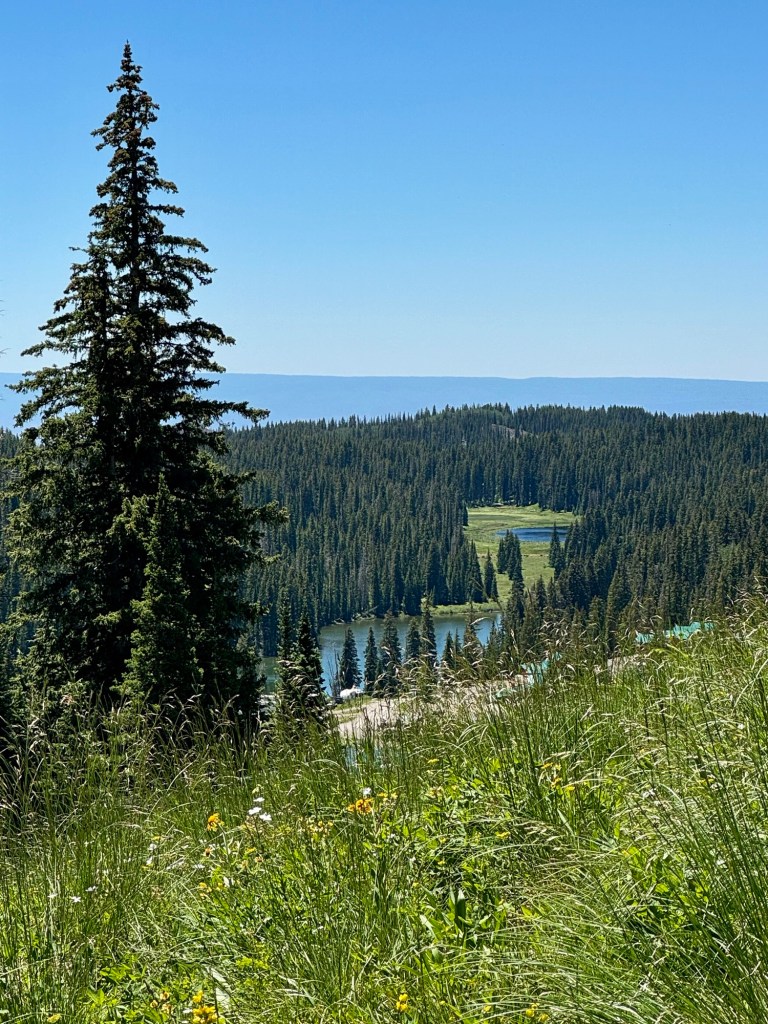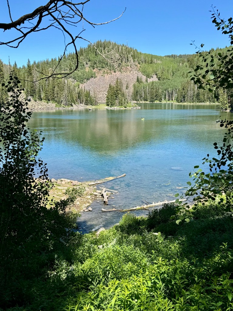 As we climbed, the elevation provided a unique perspective on Grand Mesa’s geological features. We passed Forrest Lake and other ponds, encountering open hillsides with views of all the activity around the lakes below. Wildlife sightings and diverse flora added to the trail’s allure. We made our way to the West Trailhead and finally back to camp.