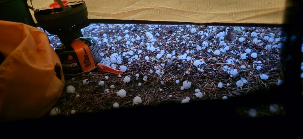 After arriving at the North Fork trailhead where there is plenty of space to camp we set up, made dinner and hung our bear sacks before relaxing and settling in for the night. This night was a great gear check for my Teton Sports single person backpacking tent and Gregs new backpacking tent as we could hear the roar and thunder of a storm heading our way. We hunkered down for the night about 8pm as the storm blew in dropping large marble sized hail on us and raining sideways, we were thankful for the tree cover we set up camp in and the quality of our rainfly to keep us and our things dry and warm.