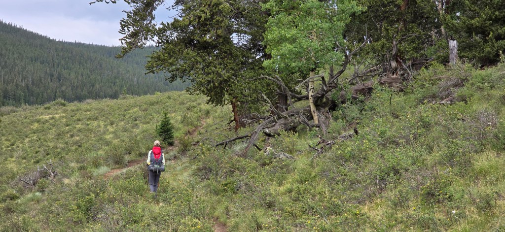 Day two with rain still dripping on us from the trees above, we packed up camp and headed back on the trail, crossing the creek we had used to resupply our water the night before and we were back on the trail to complete our quick trip. Thankful for the cloud cover as we set back out on the trail as the first few miles from this point is very exposed as we follow the valley up toward the Long Gulch trailhead where Crystal would pick us up. Once getting to the end of the valley and back into the trees it began to rain and Hail again, so for the first time we stopped and put on our rain jackets and pack covers. As we descended down the steep trail toward the Long Gulch trail we picked up a fellow solo backpacker to talk to as we hiked through the rain and hail making the section of trail fly by as we shared stories on the trail. Greg and I turned down the Long Gulch trail to find our ride thankful to see Crystal and the Jeep waiting for us, and get out of the rain until next time!