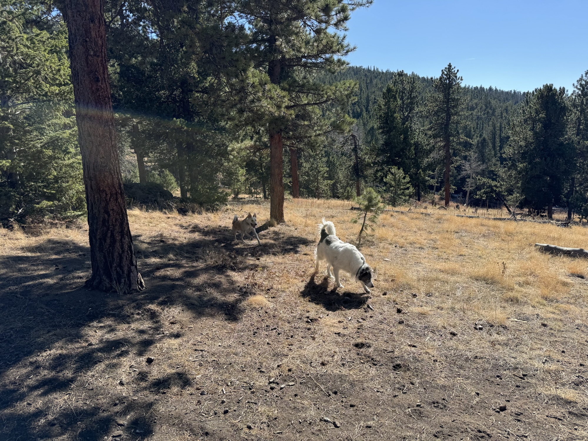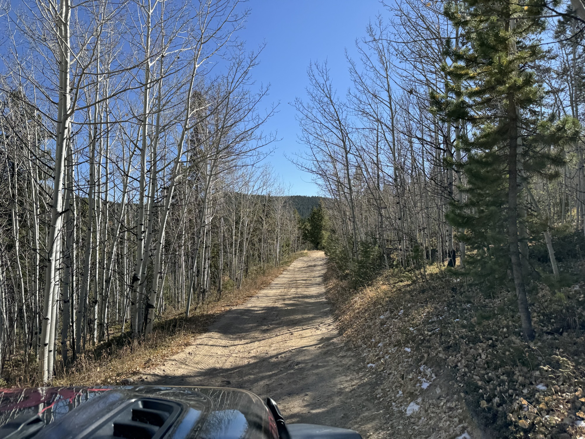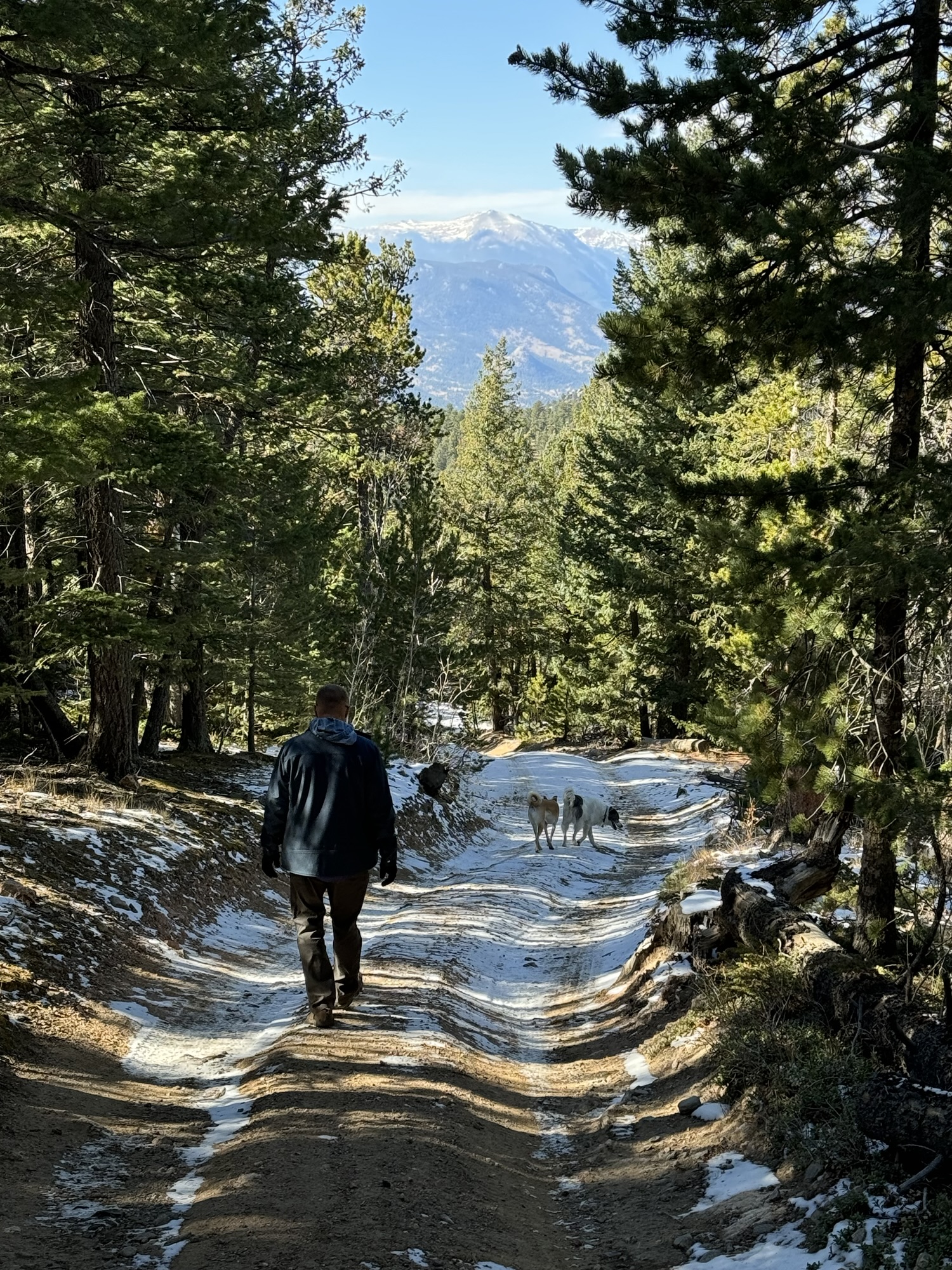 Eventually, we reached a four-way intersection where we paused to consider our options. The left trail looped around through the trees, reconnecting with FR122, but we opted to head right, following FR247A toward Panorama Peak. This route guided us eastward through towering pines and golden aspens, offering a mix of shade and sunlight filtering through the trees. The trail has several pull-offs and lookout points with gorgeous vistas of the mountains and valleys around us. We paused often to take in the views, and letting the dogs stretch their legs.