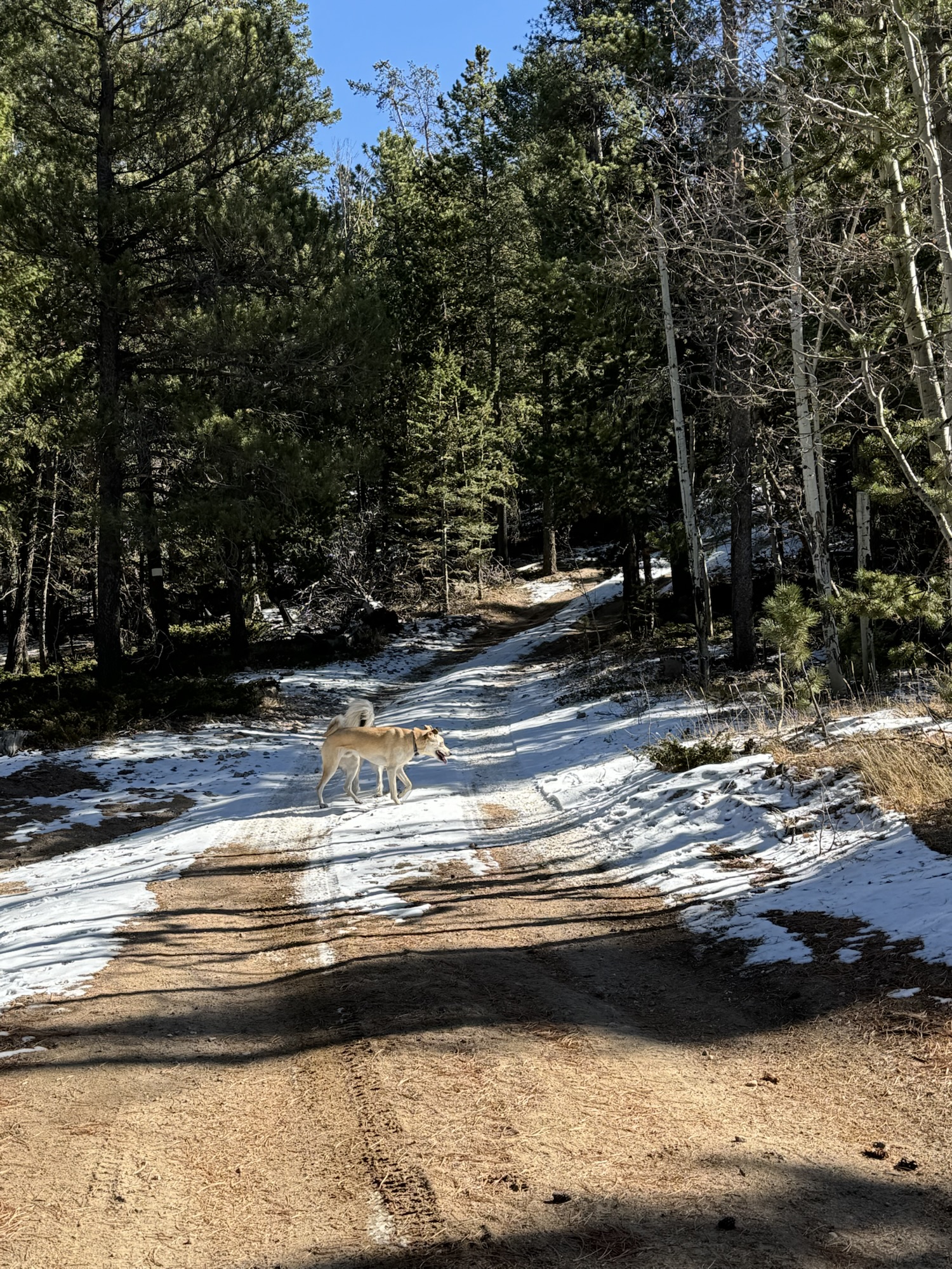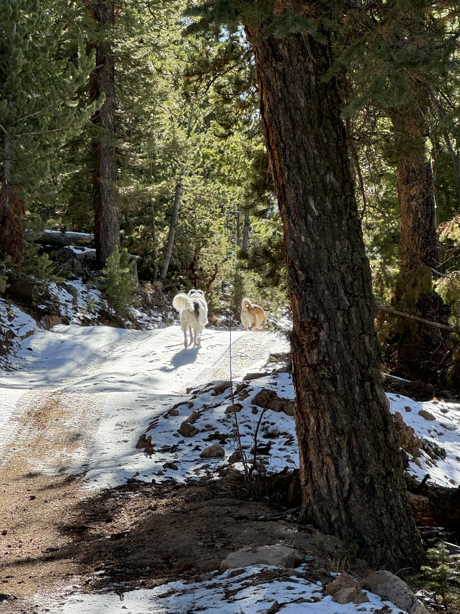 Continuing along the trail, we noticed remnants of snow from a recent storm that had passed through about a week earlier. Here and there, the snow lingered in shady patches, adding a bit of charm to the trail. The cooler weather was perfect for the dogs, who loved bounding through the snowy sections with endless energy.