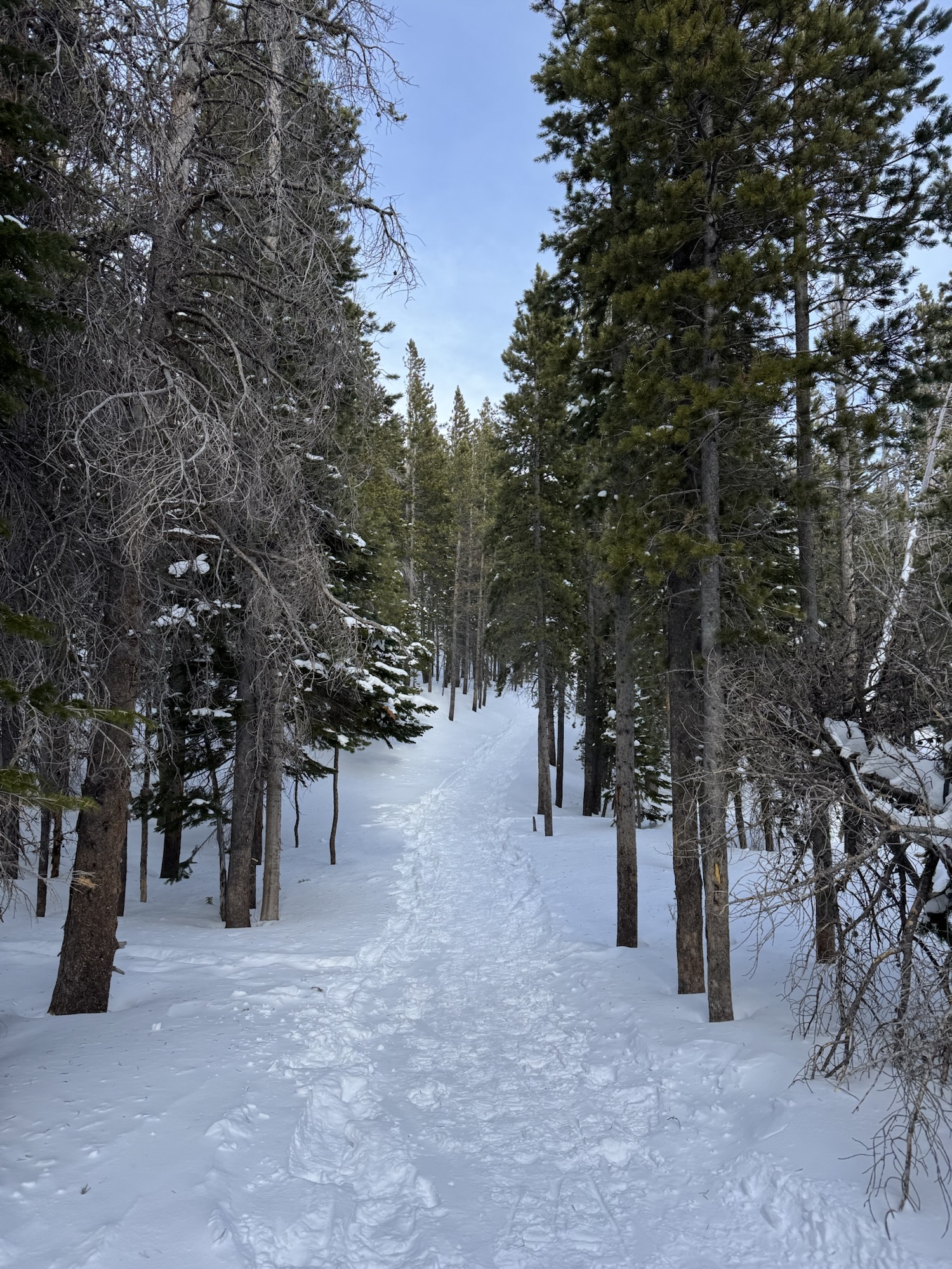 When we first drove into the park, there was no snow in sight. But as we climbed higher toward the Bear Lake parking lot at 9,500 feet, the landscape began to transform. Snow-capped peaks emerged in the distance, hinting at the quiet magic waiting for us. A recent snowstorm had dusted the trails with fresh powder, but luckily, the trail was packed down enough that we could hike with just our microspikes, instead of snowshoes. In a few places, it was a delicate balance between the two, but we embraced the challenge.