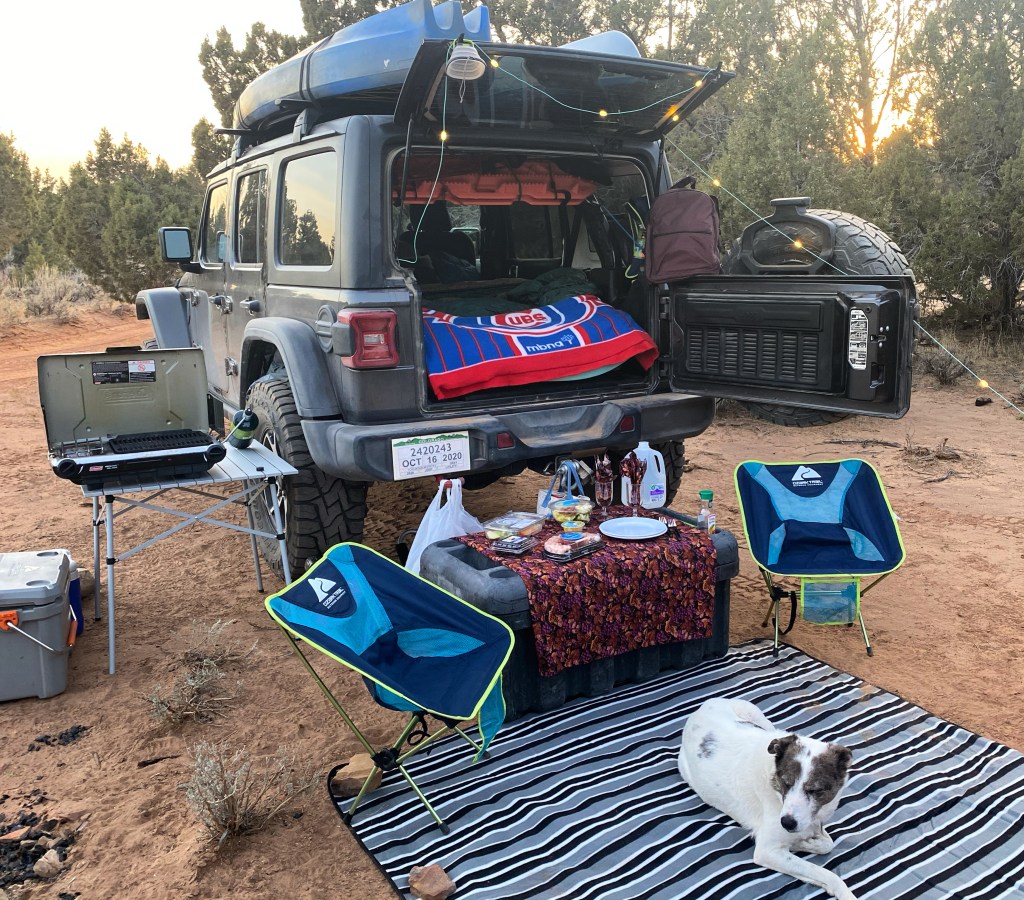 Bill and I have camped out of our Jeep many times, especially when we first started overlanding. It was our go-to setup for trips where we moved camp each day because it was so quick to set up and break down. One of our first experiences sleeping in the Jeep was during a trip to Havasupai, Arizona. We arrived at a dispersed campsite with a group of friends around 10:30 p.m., well after dark. While others wrestled with setting up tents—and avoiding cactus—we simply pulled out our gear bins, rolled out our sleeping pads and bags, and were cozy in the back of the Jeep before anyone else was done. It was simple, efficient, and surprisingly comfortable.