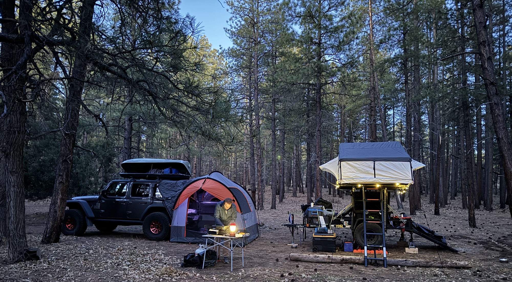 You can even create hybrid setups to meet your specific needs. For example, when we bring the dogs on an overlanding trip, our 100-pound Great Pyrenees mix can’t exactly climb into the rooftop tent—so we bring a standard tent that connects to the Jeep. It gives us a combination of car camping, tent camping, and RTT living all in one trip.