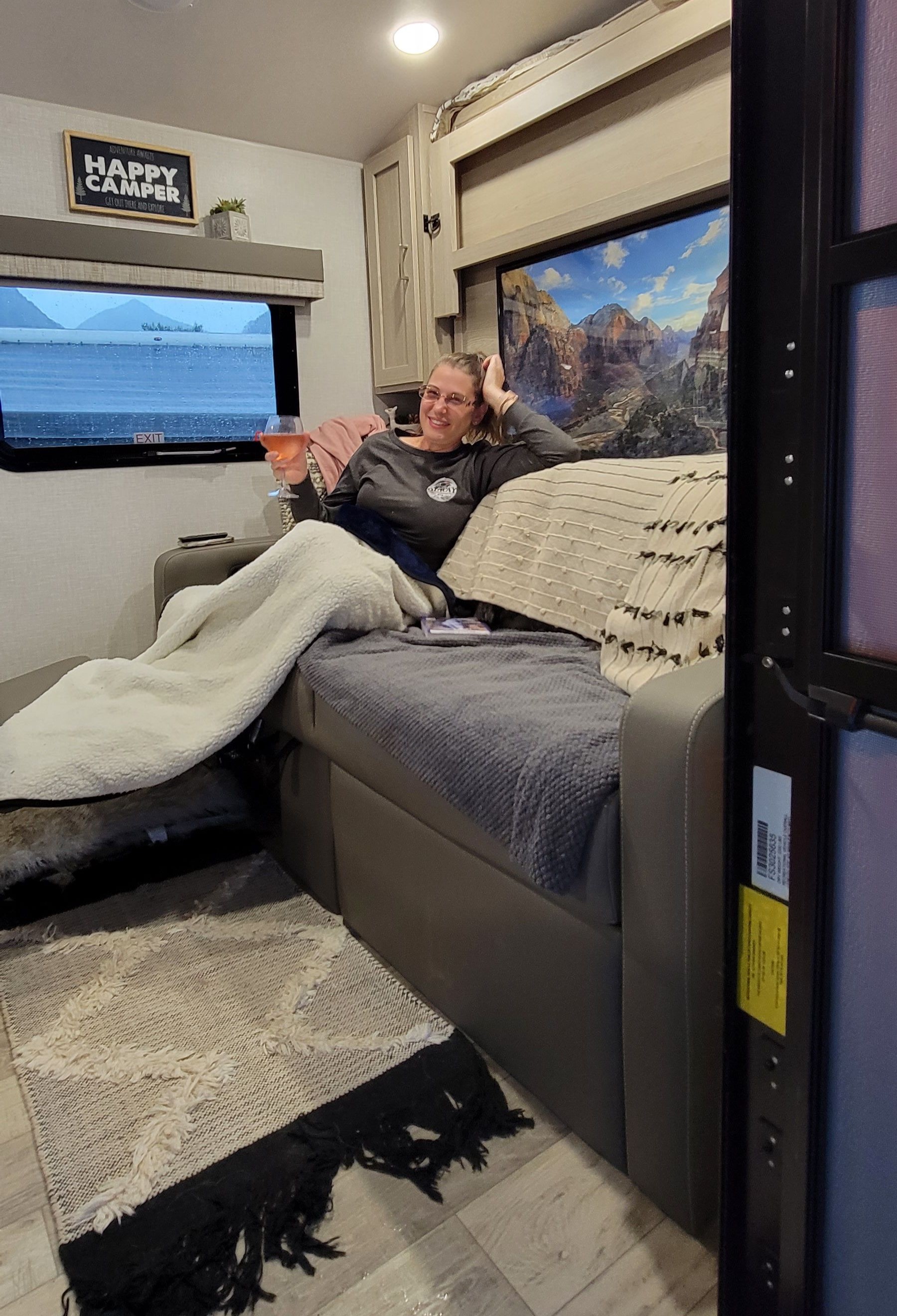 Our trailer is designed for boondocking and off-grid use, with two 200-watt solar panels on the roof and the option to add a third through a side port. It’s wired with a 1,000-watt inverter and powered by two 100-amp lithium batteries, so we can stay out longer without hookups. Setup is quick and easy, which is perfect for spontaneous stops or longer stays. I especially love having access to a bathroom on cold mornings or rainy nights, and when the weather turns, it’s a cozy escape—we’ve spent a few evenings curled up on the couch watching movies while storms rolled through. It’s also been great for shoulder-season camping, where the temps drop but we stay warm inside.