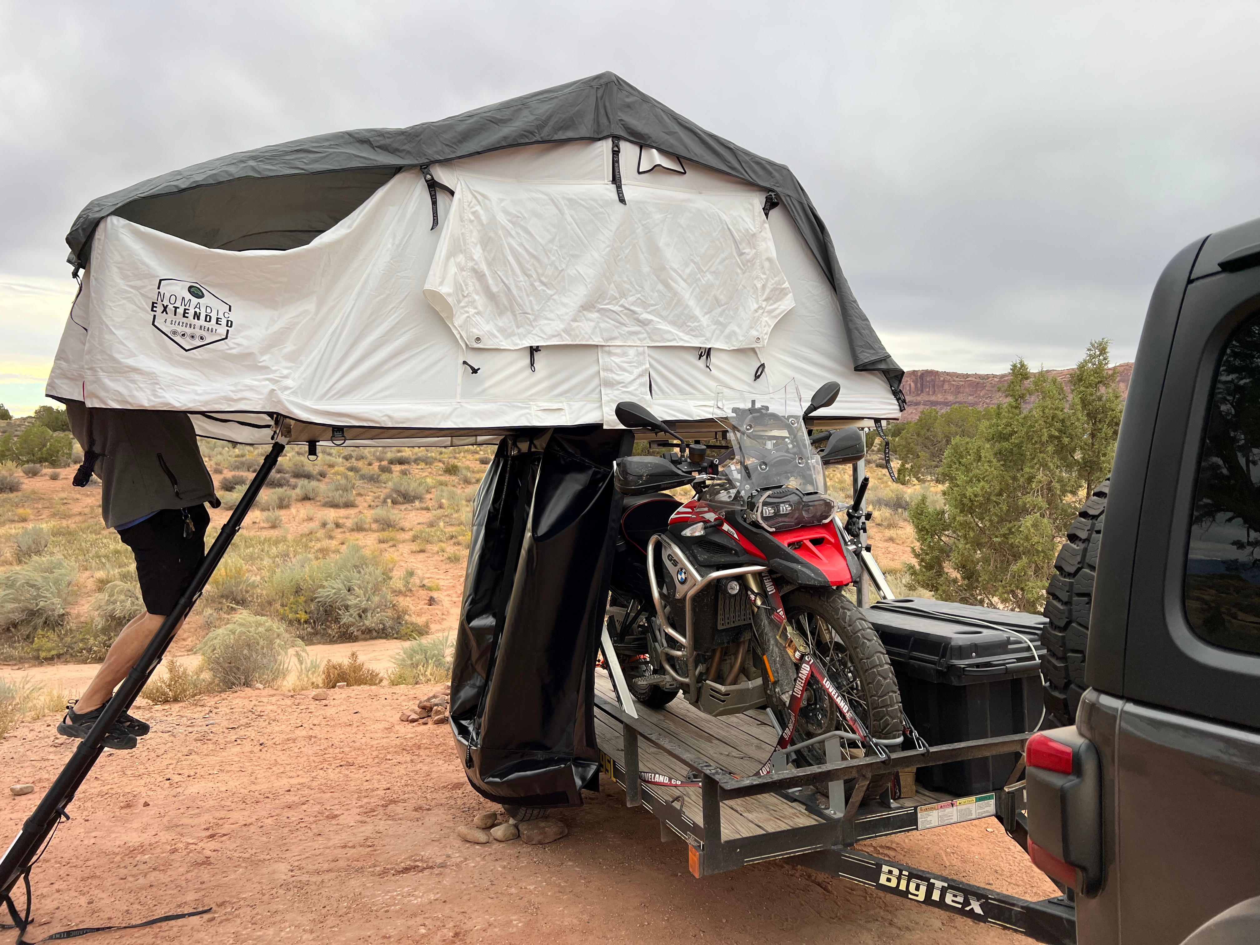 To make the setup even more versatile, we decided to mount our RTT to an overlanding trailer rather than directly on the vehicle. This way, we can disconnect the trailer for daily adventures and always come back to a ready-to-go home base. Bill customized the trailer with off-road tires, a sturdy unistrut frame, a beefier axle for better clearance, and even a pivoting frame that allows him to tow his adventure motorcycle underneath. He also added a water tank for easy rinsing after hikes or cleaning up around camp. Mounting the RTT on a trailer has made a huge difference—it gives us extra storage space, frees up room inside the vehicle for dogs, friends, or family, and makes our entire setup more comfortable and self-sufficient.