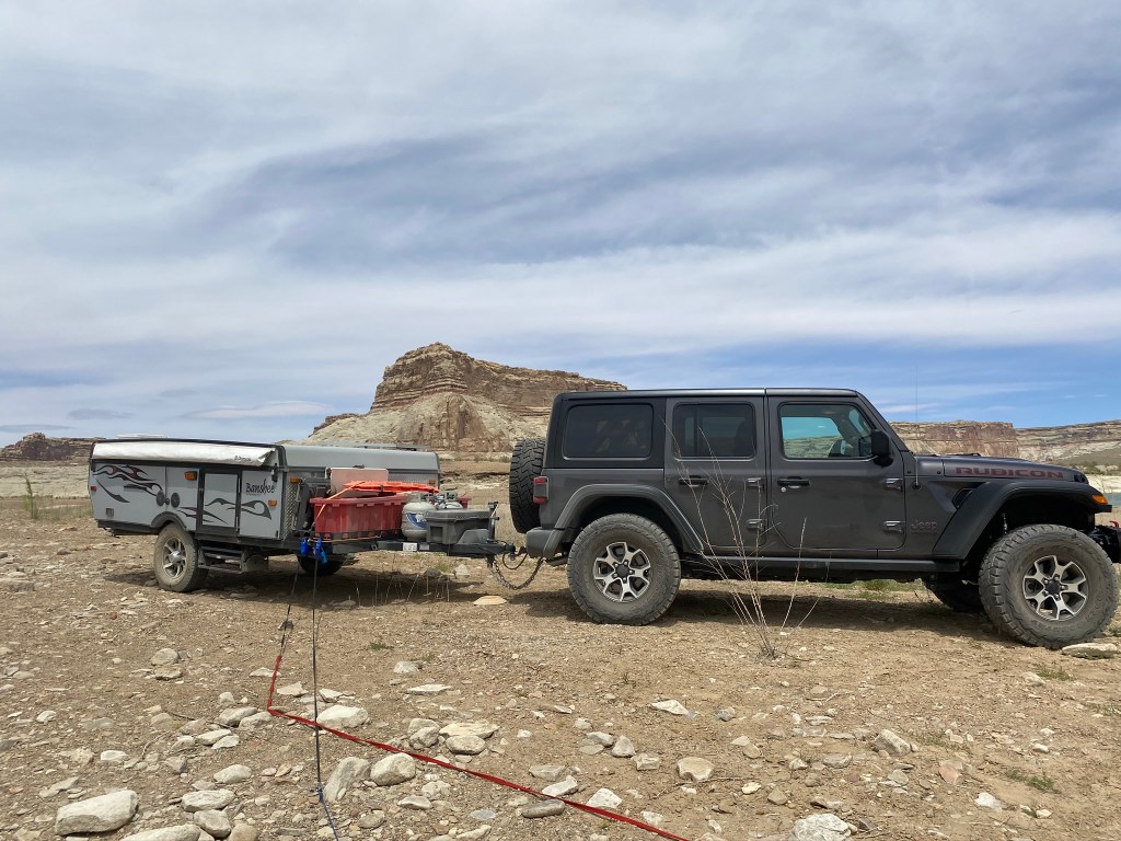 Bill and I had a pop-up camper for about two and a half years, and it made for some memorable trips. It towed easily behind the Jeep, and once we had our setup routine down, we worked as a great team to get it ready quickly—even if the process could be a bit of a chore at times. With the slides out, it felt surprisingly roomy—plenty of space for us and the dogs, and a comfortable retreat from the wind, rain, or heat. We never had issues with staying too cold or too hot, especially when we were hooked up to power and could use the heated mattresses. What really sold us was its ability to go where most campers can’t. We took it off-road, through canyons, over uneven mountain trails, all the way to the shores of Lake Powell and even across deep sand to the beaches at Lake McConaughy. Of course, it came with a bit more maintenance than tent camping, but the comfort and versatility were worth it.