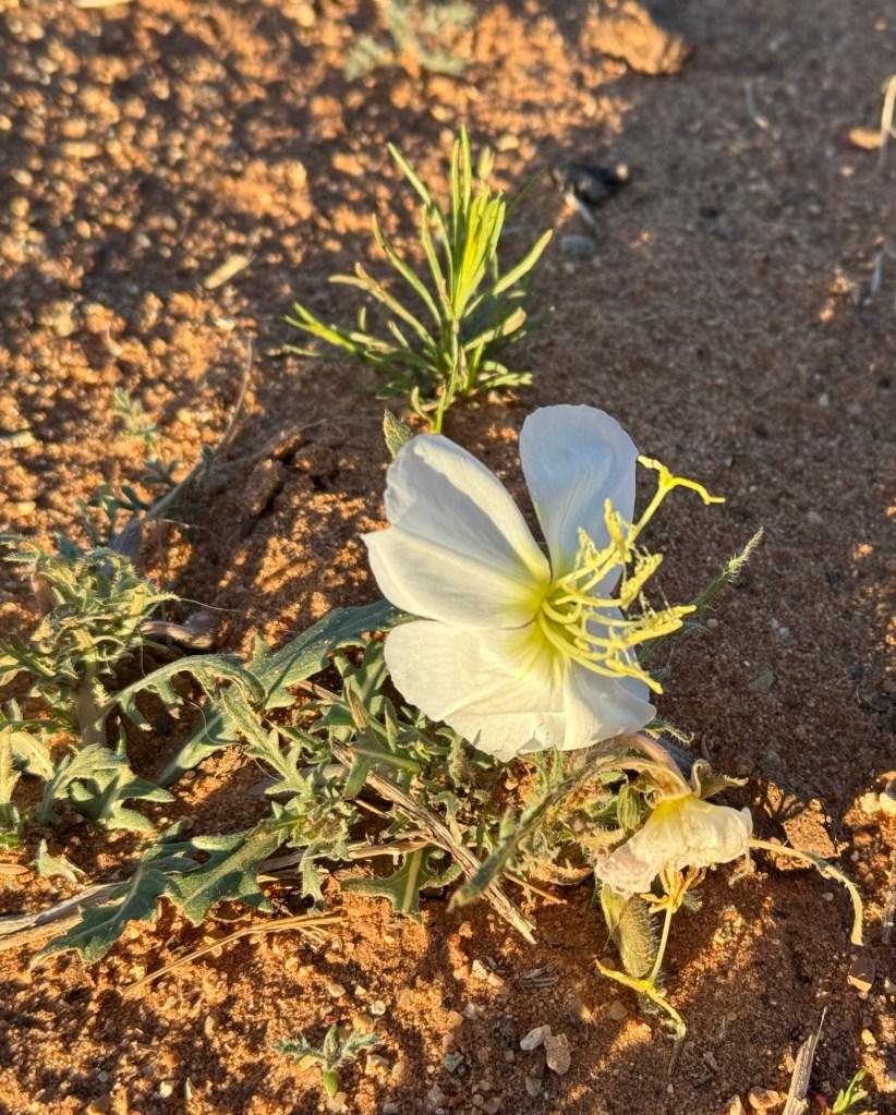 As the sun lowered behind the cliffs, golden hour cast a magical glow over the landscape. I wandered around camp, watching a tiny bird dart between desert shrubs in search of dinner. It didn’t seem bothered by my presence, going about its evening routine like I wasn’t even there. Nearby, delicate white wildflowers bloomed bravely from the sandy soil, their petals fluttering in the wind.