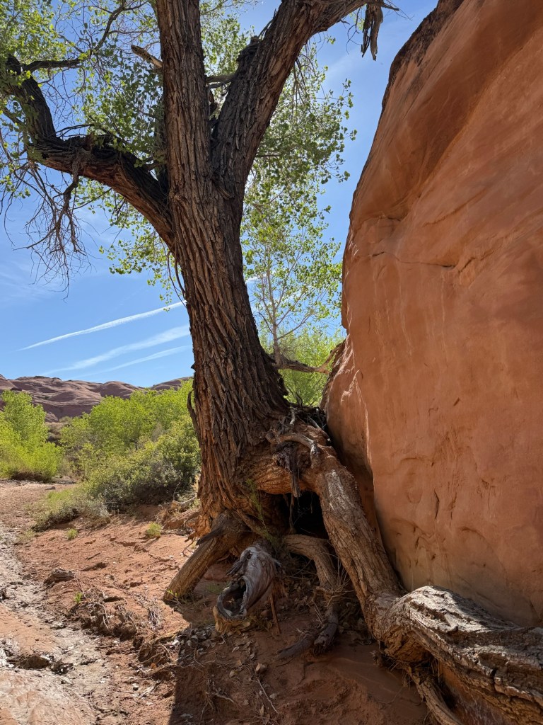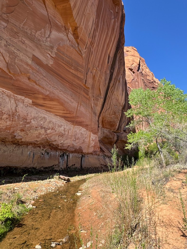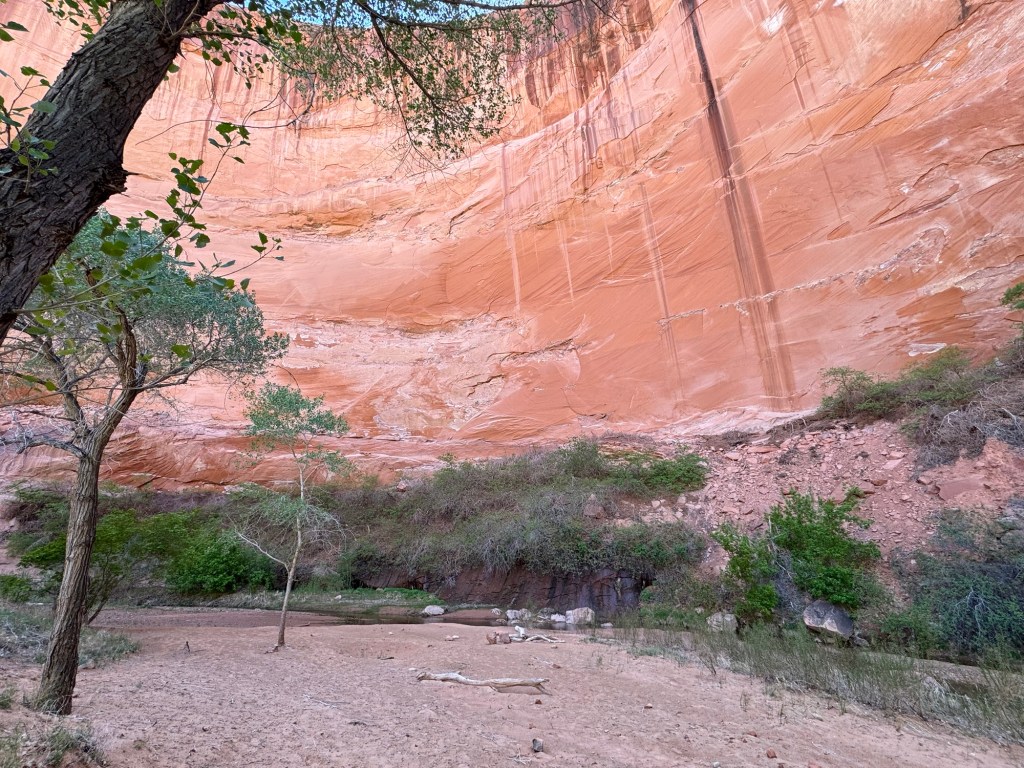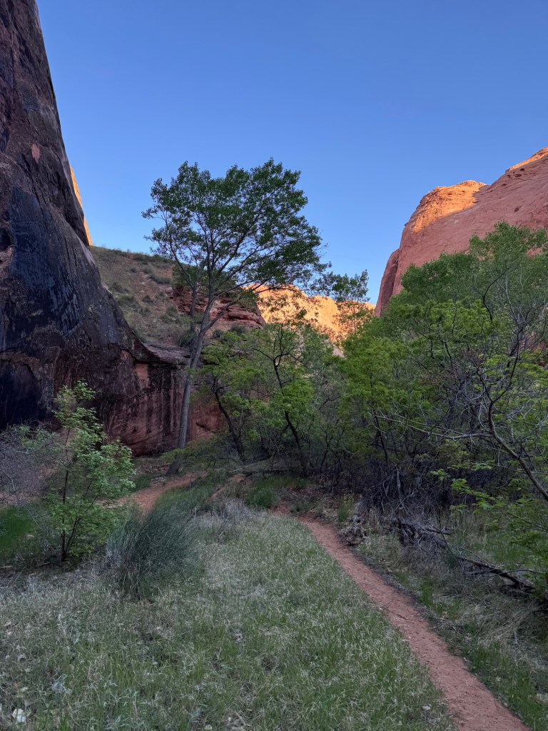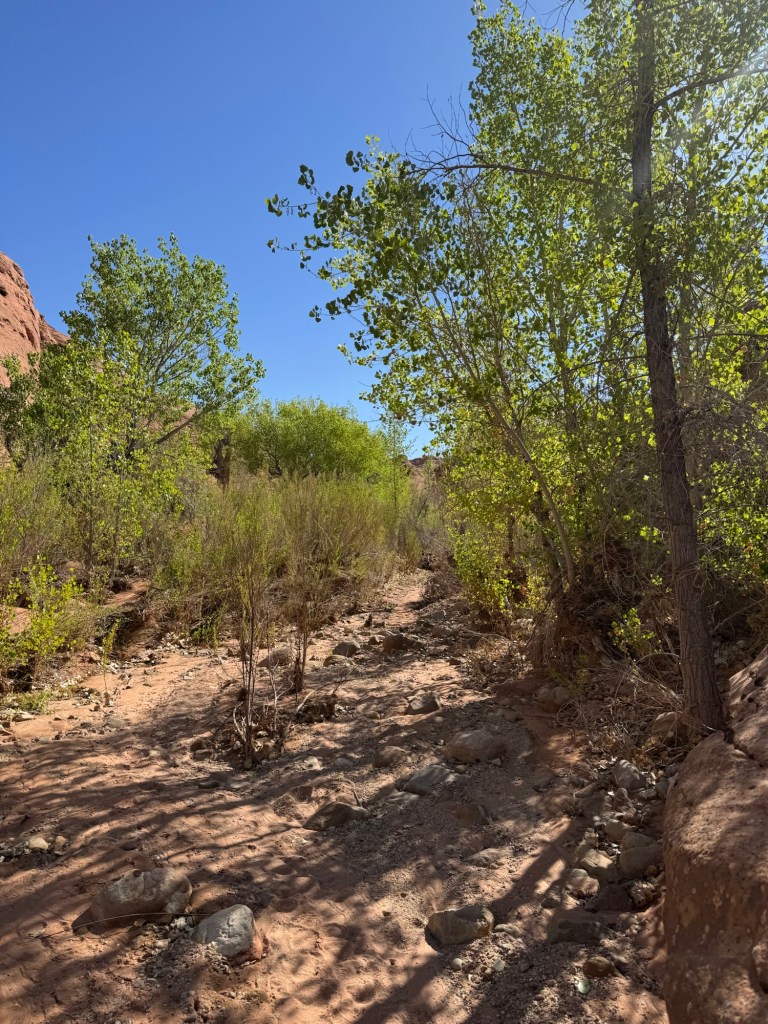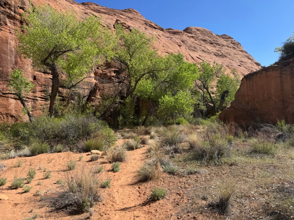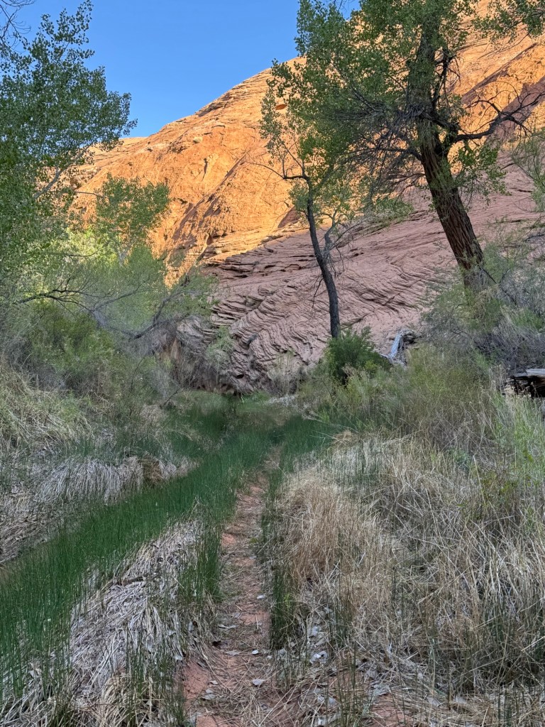 Before long, I crossed into Glen Canyon National Recreation Area and the scenery began to shift. Towering canyon walls gradually rose around me, and the temperature dropped. The dry, desolate wash transformed into a lush canyon corridor, rich with life. Cottonwood trees showered the air with drifting cotton, and a small stream began to wind along the trail.