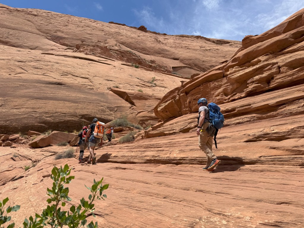 At the confluence with Constrychnine Canyon, we paused. Most groups take the gradual slickrock walkout from here, but ours? We had other plans: an up-climbing extravaganza.