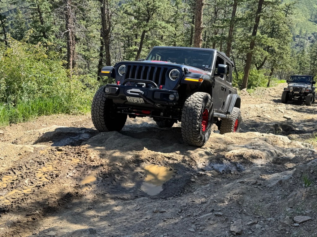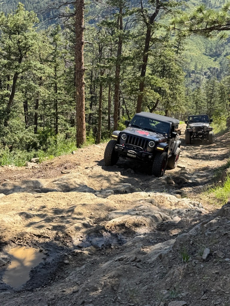 With the Jeep aired down and trail mode on, we tackled the early boulder fields and tight turns, inching our way up ledges and weaving through a pine-draped corridor of dirt and granite. This trail doesn’t just test your rig—it tests your focus, your tire placement, and your confidence. It’s a good kind of challenge, the kind that gets your adrenaline going and keeps your eyes locked forward.