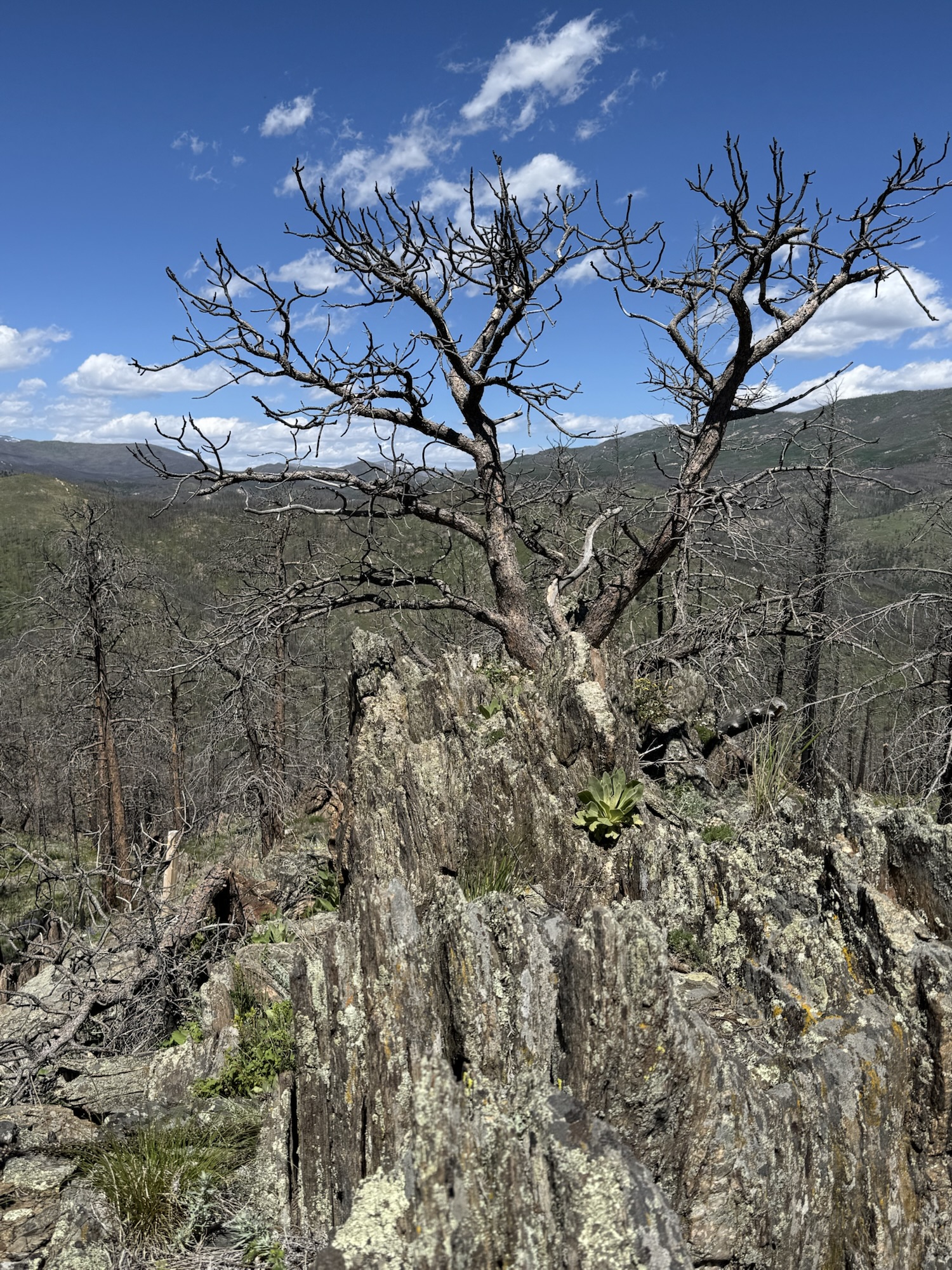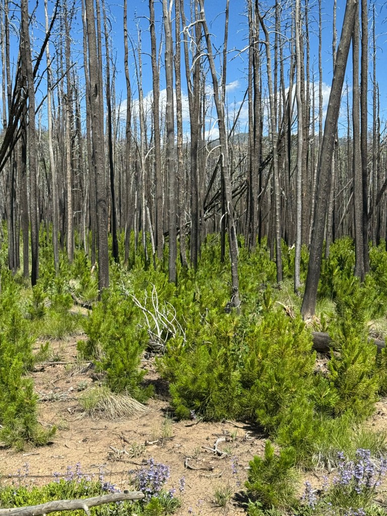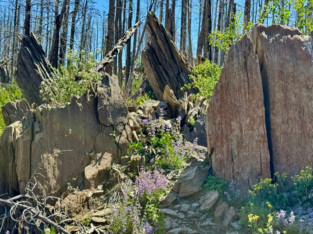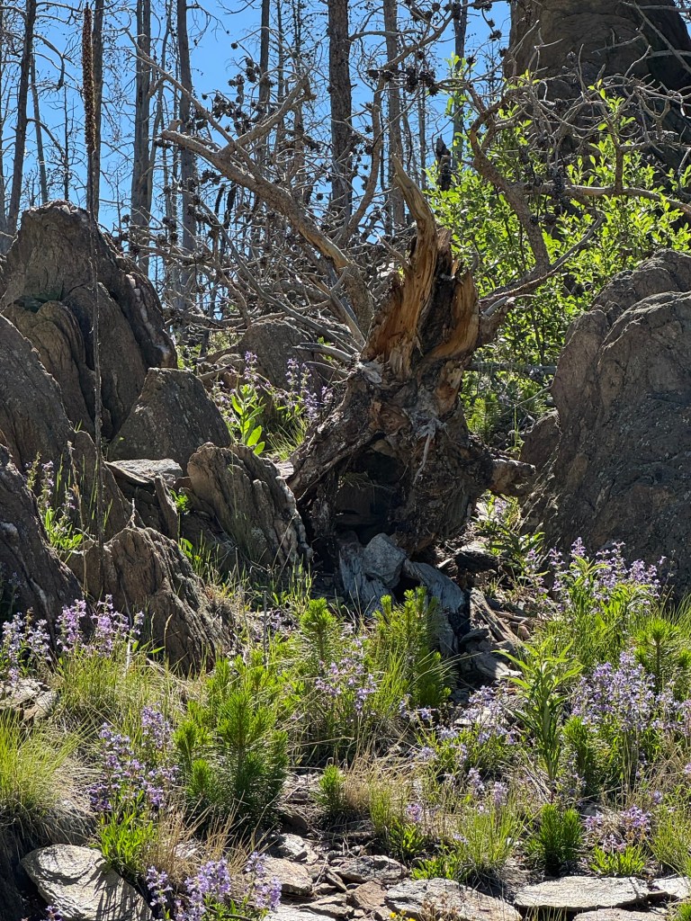 As we gained elevation, the terrain told its own story. Evidence of past wildfires was everywhere—charred trees stood like sentinels, but between them, life was returning. Bright green grasses lined the trail, wildflowers bloomed defiantly, and new pine saplings pushed skyward, reclaiming the landscape one sprout at a time. Purple penstemon danced in the breeze, and vibrant yellow blooms dotted the slopes like sparks of hope.