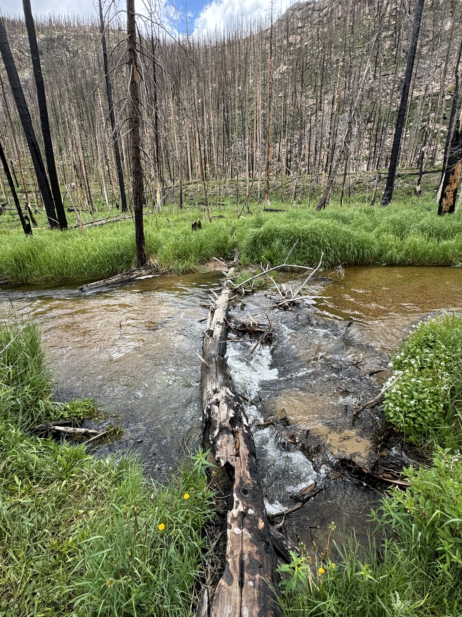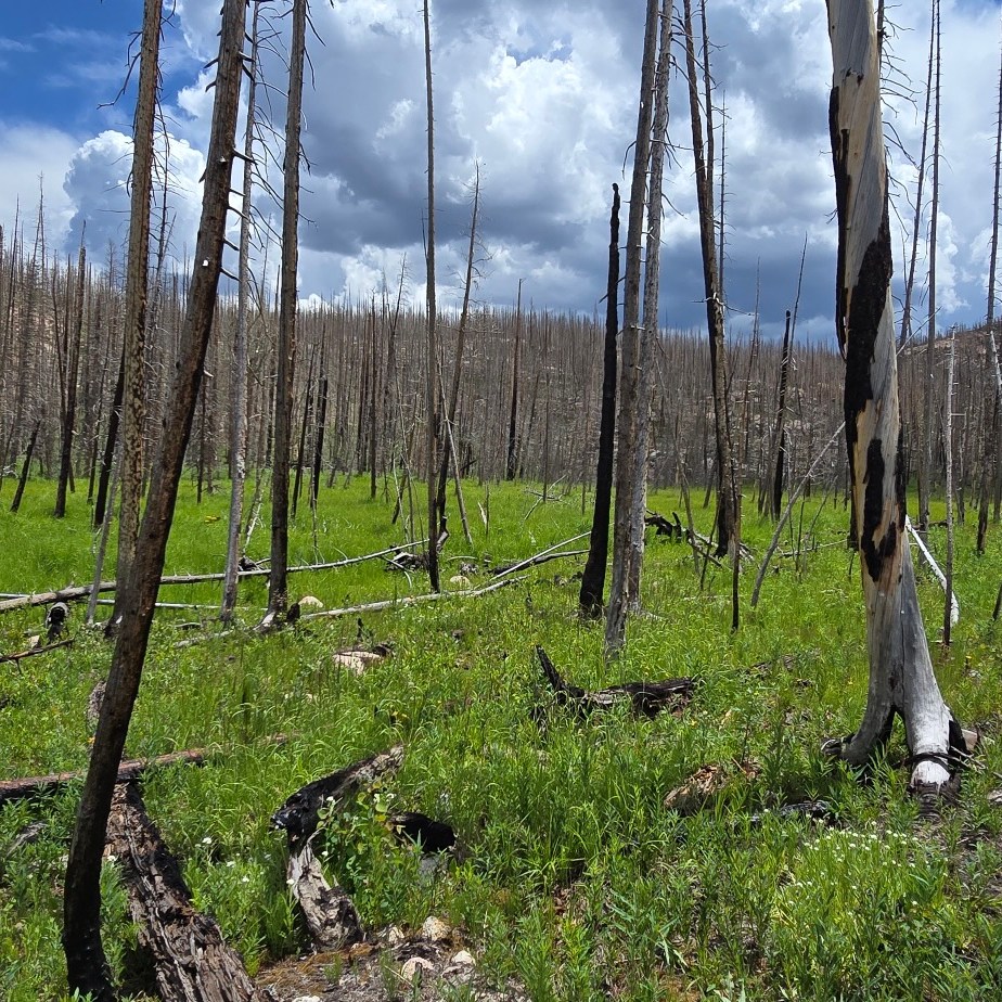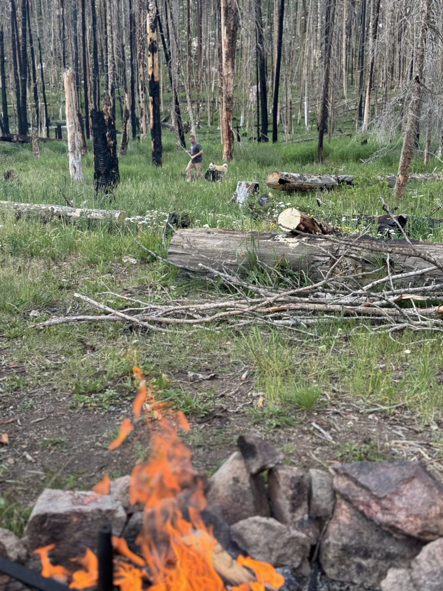 While Greg and I were out along the West Branch Trail, Bill took Lennon and Dasher on a ridgeline above camp. The area, scarred by the Cameron Peak Fire, is now a ghost forest of tall, charred trunks—silent sentinels standing over a rebounding landscape.