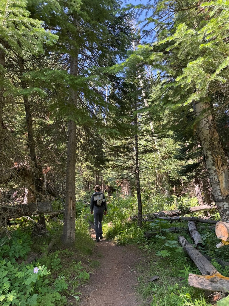 While we didn’t trek all the way to the alpine lakes, we found our reward in the little things: glimpses of snow-streaked peaks, open meadows blooming with paintbrush and columbine, and a stunning buck with velvet-covered antlers stepping onto the trail ahead of us before vanishing into the trees.