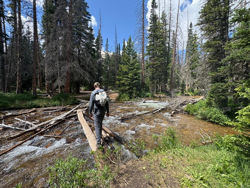 Throughout the hike, small streams flowed across the trail, fed by snowmelt and shaded by wildflowers and mossy rocks. One narrow chute bubbled cheerfully between boulders, another spilled like a miniature waterfall beneath a fallen tree. Every few steps, we were reminded of the wild water that shapes this land—and how alive everything is in summer’s peak.