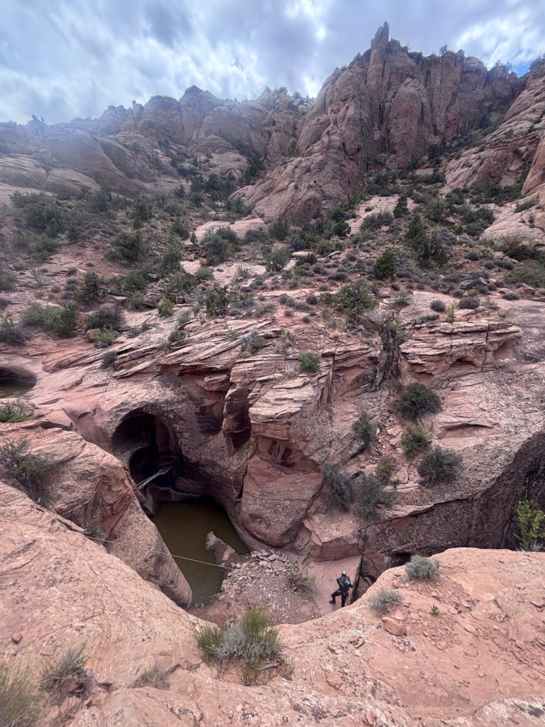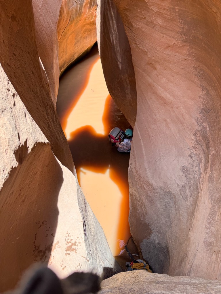 The final rappel was one of the most memorable—a dramatic two-stage drop that delivered us into a wide, echoing chamber with sheer walls and a murky pool waiting at the bottom. The first stage eased us down a sunlit wall, but the second part launched us straight into the water. Cheers rang out as one by one, we touched down in the pool—some gracefully, others with an enthusiastic splash. We stripped off gear and lounged on the sandy ledges, taking in the grandeur of the chamber and the red sandstone walls rising around us. It became our canyon lounge: packs scattered, laughter echoing, photos snapped, and friendships sealed with muddy water and pure joy.