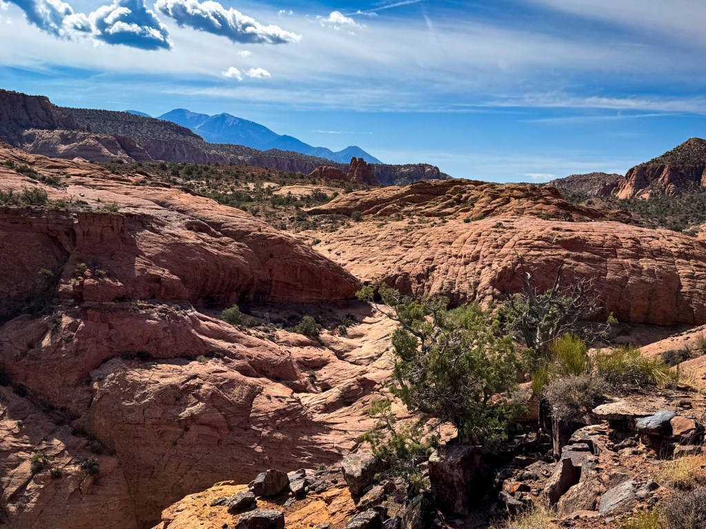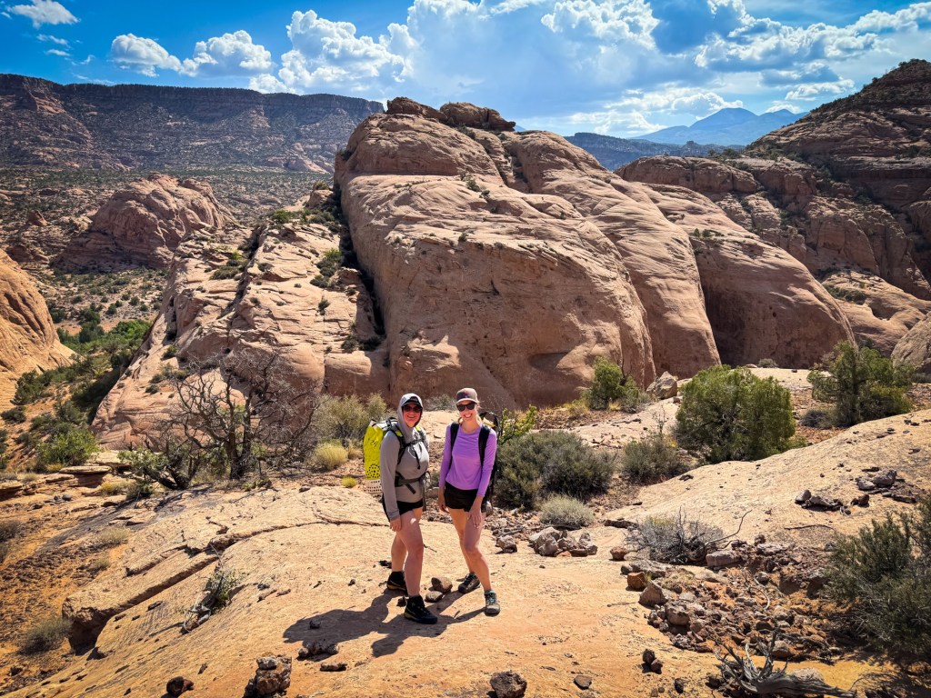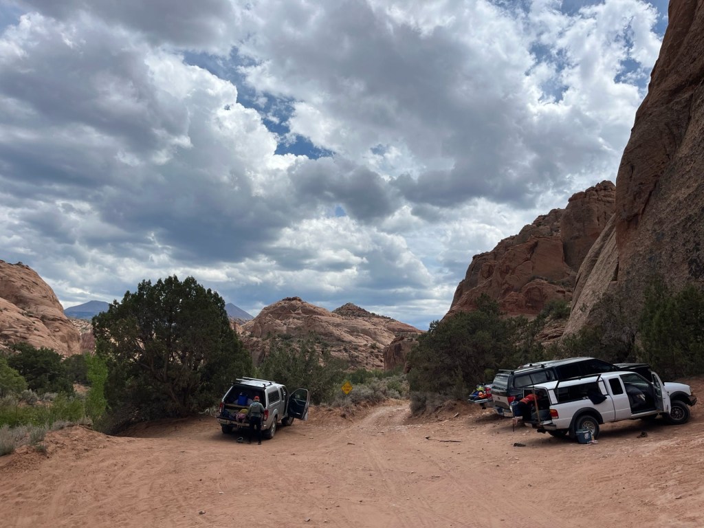 We kicked off Day 2 buzzing with energy and anticipation as 24 women piled into four trucks, ready for another round of desert magic. Fueled by coffee and layered in sunscreen, we rumbled down classic Moab roads—dusty, winding, and flanked by wide-open skies and rust-colored sandstone that stretched toward the horizon. When we finally pulled up to the trailhead and shouldered our packs, the La Sal Mountains rose in the distance like familiar old friends, quietly standing guard.