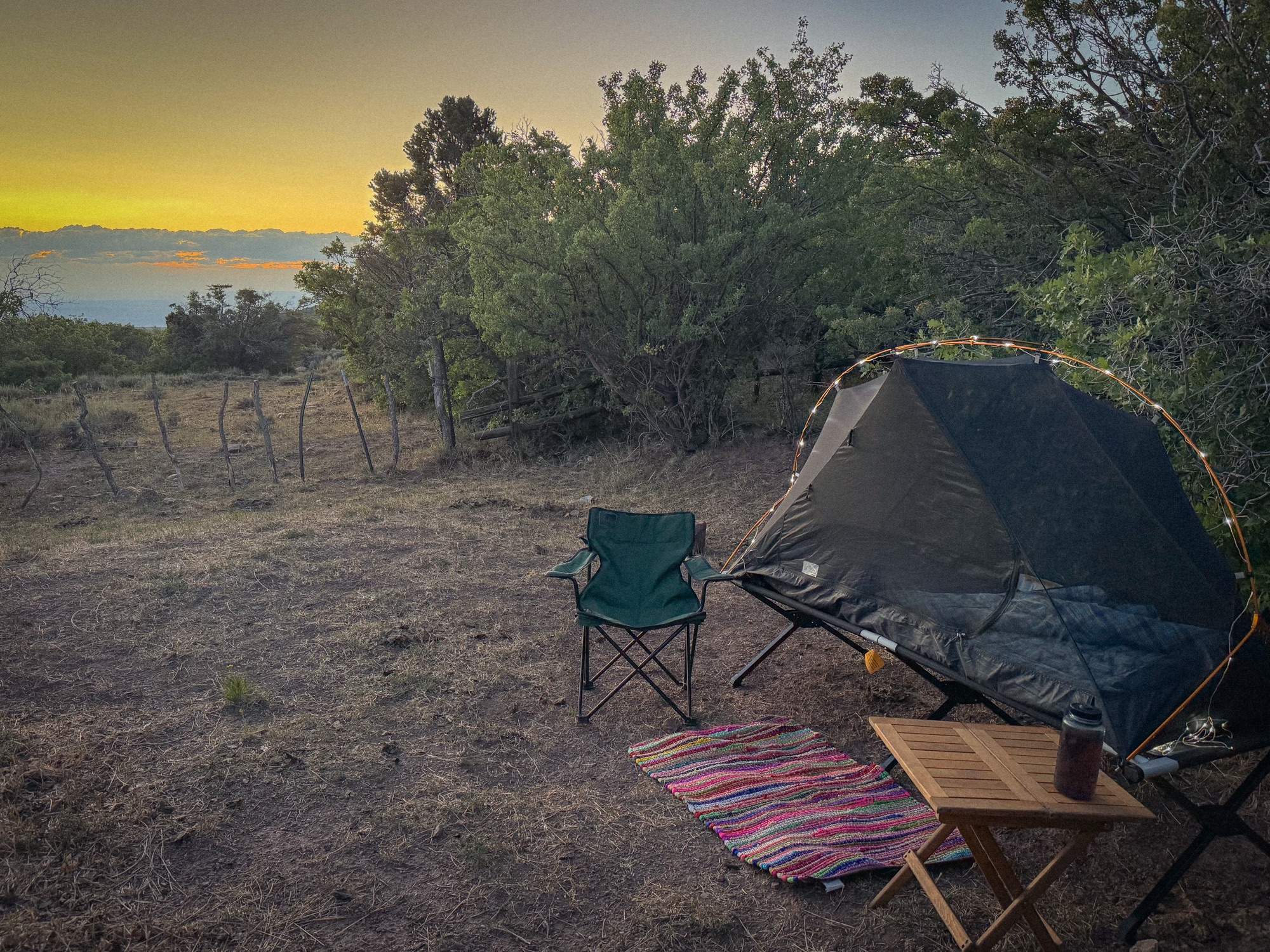 That evening, I was still buzzing from the day’s adventure—but Utah wasn’t done with me yet. As the sky began to shift, it delivered one more show: a sunset so stunning it stopped me in my tracks. Golden light spilled through the trees, danced across camp, and slowly faded behind the desert horizon. I relaxed on a cozy blanket, popcorn in hand, as the sky melted from fire to dusk and an acoustic playlist drifted through the still air.