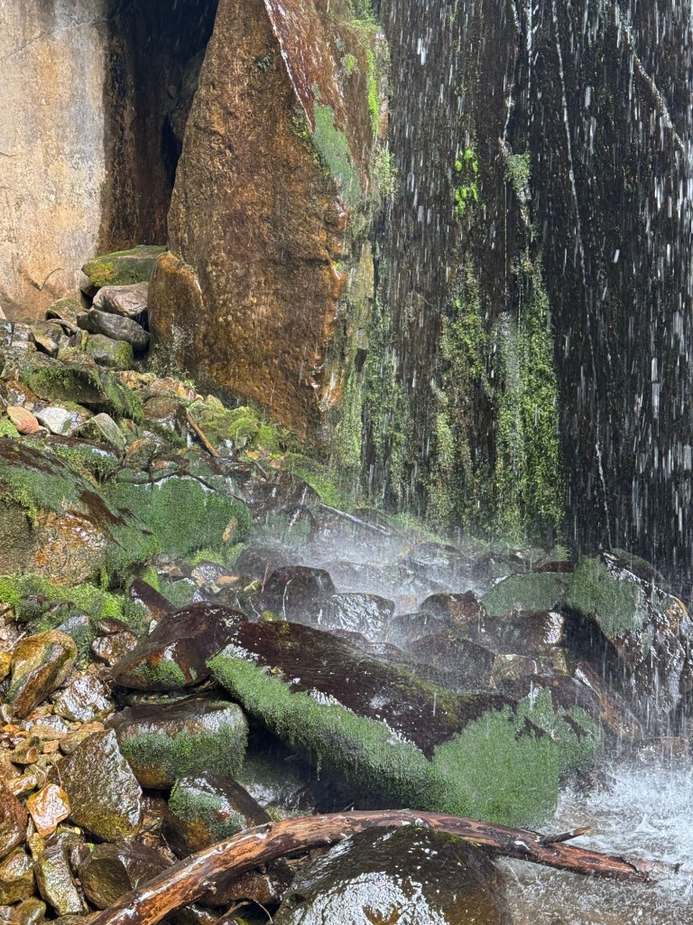 The final rappels were some of the most striking. We descended beside slender waterfalls spilling over mossy rock, their sound echoing in the chambered canyon. Each drop delivered us deeper into a cathedral of wet stone, with green-veined walls glistening under the water’s steady touch. Ropes disappeared over polished ledges as teammates cheered and spotted one another through the cascade. It was equal parts technical and beautiful—the kind of canyon where every rappel feels like a reward.