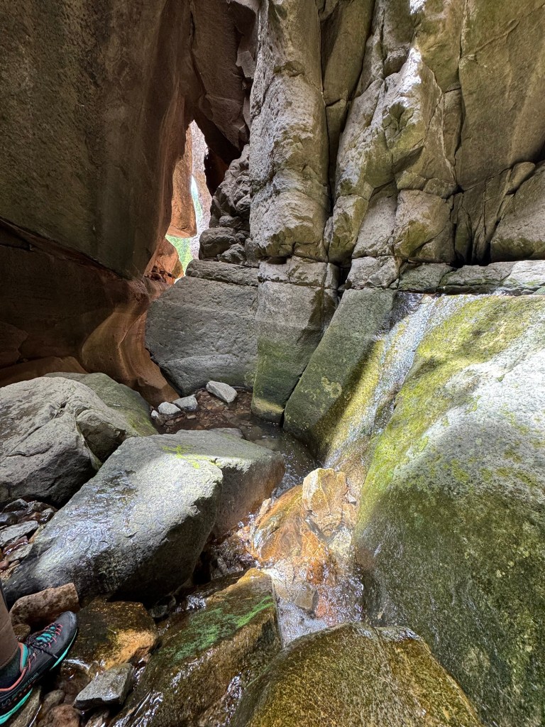 Pleiades Canyon is a rare gem—a wet canyon tucked in the mountains just above the desert floor. It felt like slipping into a secret oasis. The approach was short and sweet, winding through a lush forest trail until we reached a dry riverbed, the canyon walls beginning to rise around us. Following the winding wash down, we soon found ourselves surrounded by sculpted sandstone and the sound of trickling water. Once we reached the first flow—cold, clear, and rushing over polished stone—the real magic began.