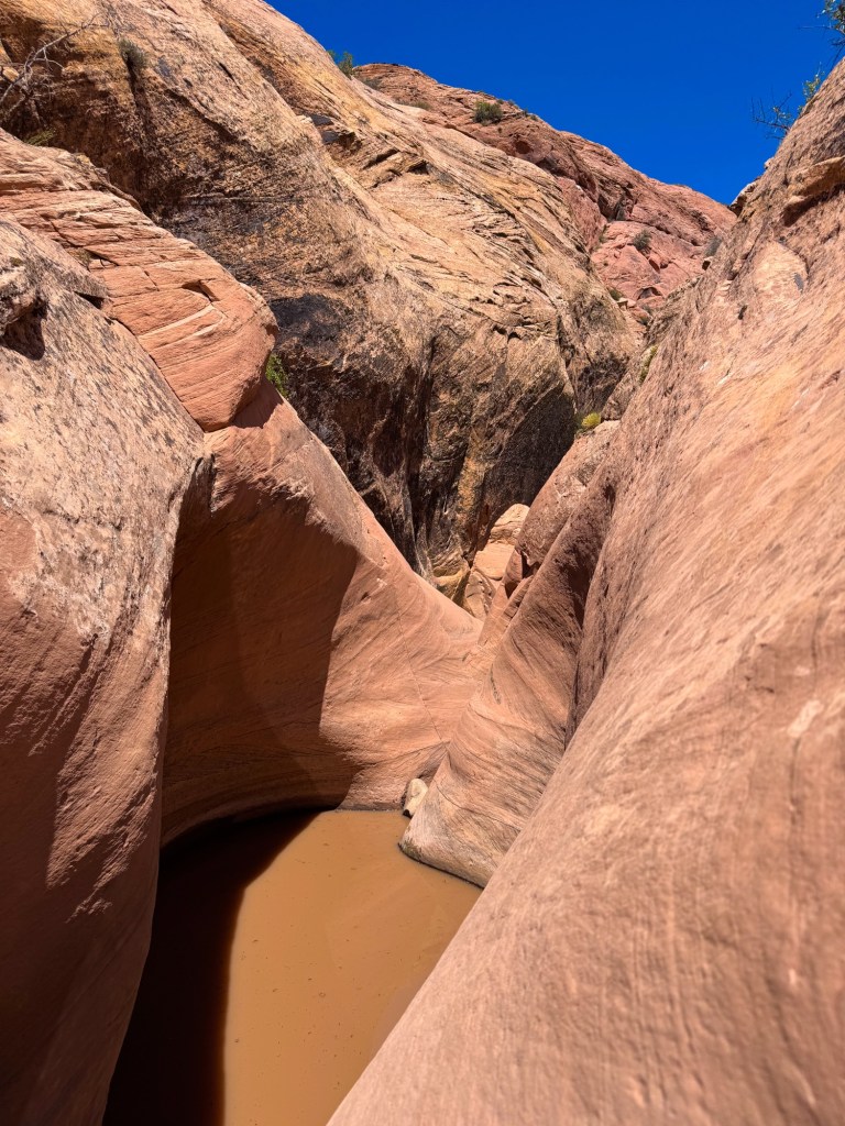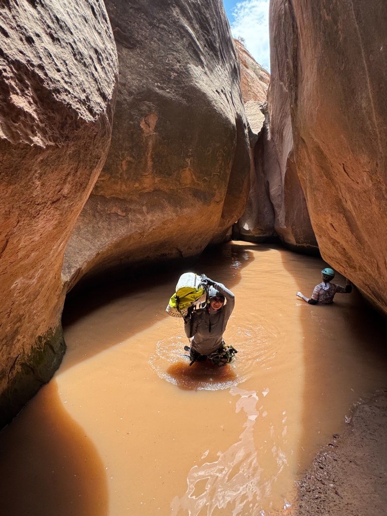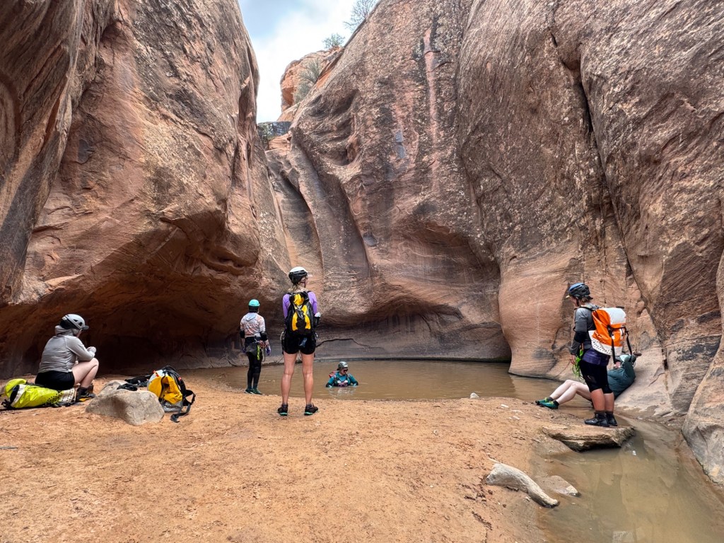 Once inside the canyon, we were immersed in nature’s sandstone playground. The canyon narrowed quickly, drawing us into its water-carved corridors. Smooth curves and sculpted walls wrapped around us like an earthen embrace. Pools of cold water waited around corners, reflecting the high desert light. Some swims were chest-deep, requiring us to float our packs and wade through with chilled determination (and a lot of joyful shrieks).