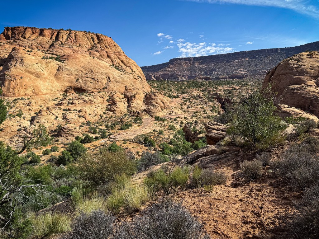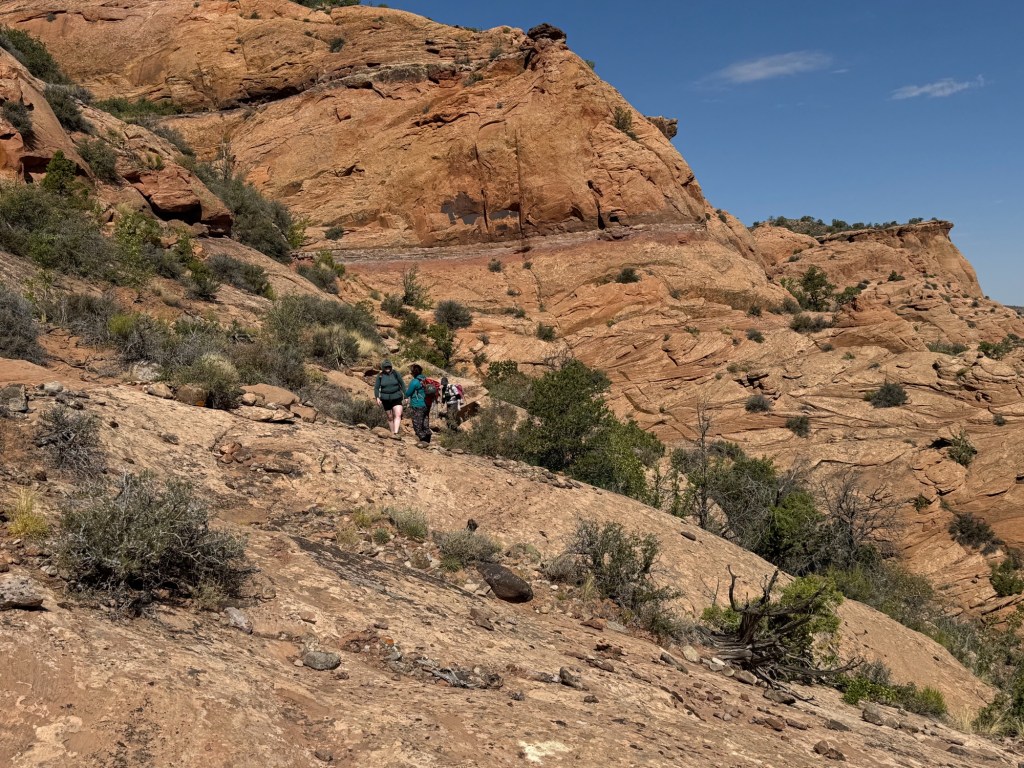 Our hike began with a climb—a steep scramble up a narrow, rocky chute that demanded both hands and a bit of grit. The sandstone radiated warmth beneath our boots, and with every step upward, the views became more expansive. Behind us, a mosaic of domes and winding canyons stretched endlessly beneath a brilliant blue sky. Waves of slickrock rippled across the horizon, broken only by pockets of desert vegetation clinging stubbornly to the cracks.