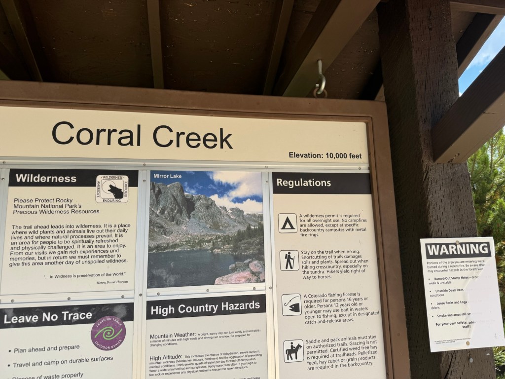 When we picked up our permits, a ranger reminded us the hike was exposed, scarred by the 2020 Cameron Peak Fire. The loss of trees meant less shade and hotter miles, but it also opened up sweeping views that might not have been visible before. With packs loaded and permits in hand, we headed up Poudre Canyon Road to Corral Creek trailhead, ready to step into the wild.