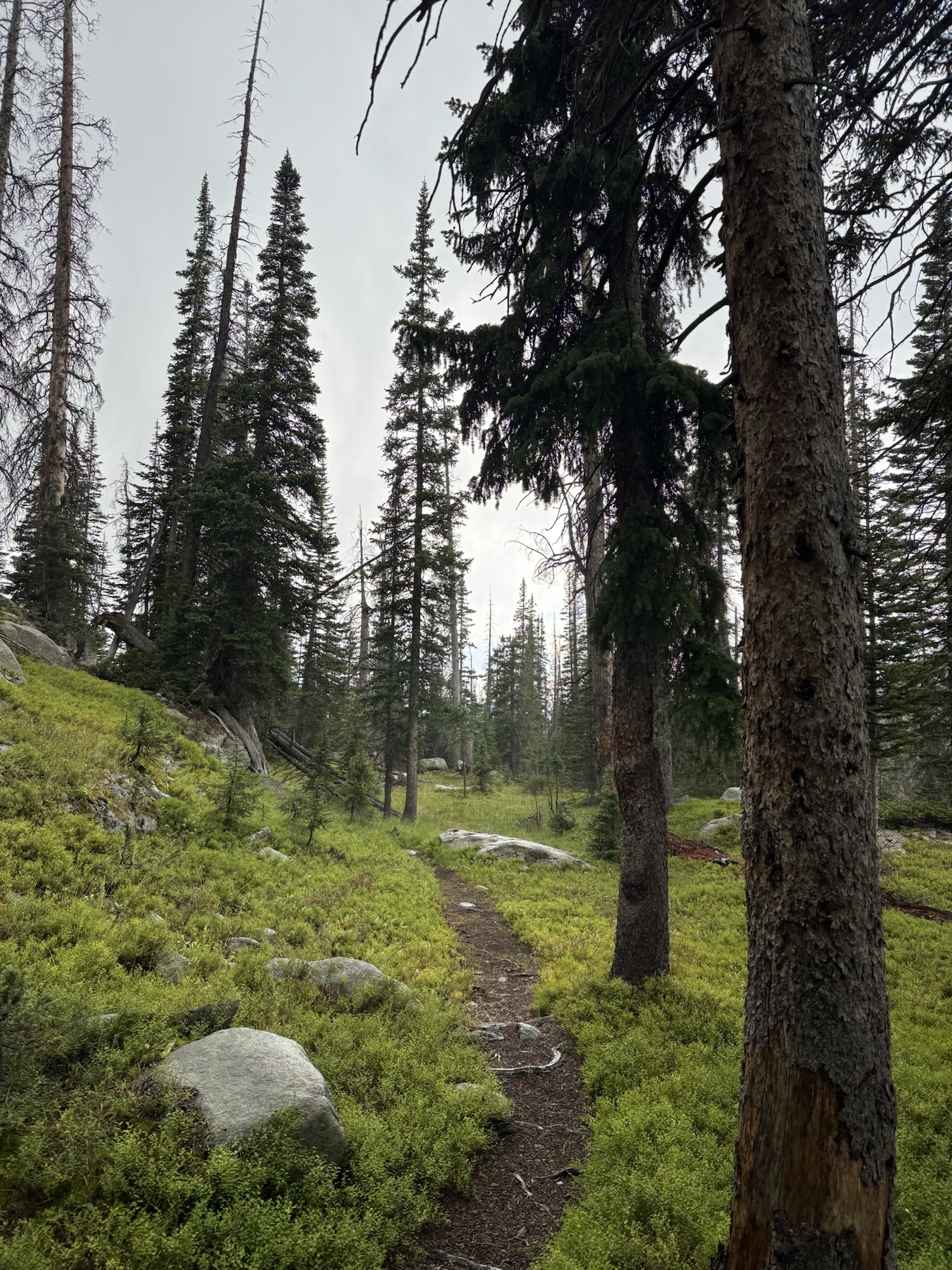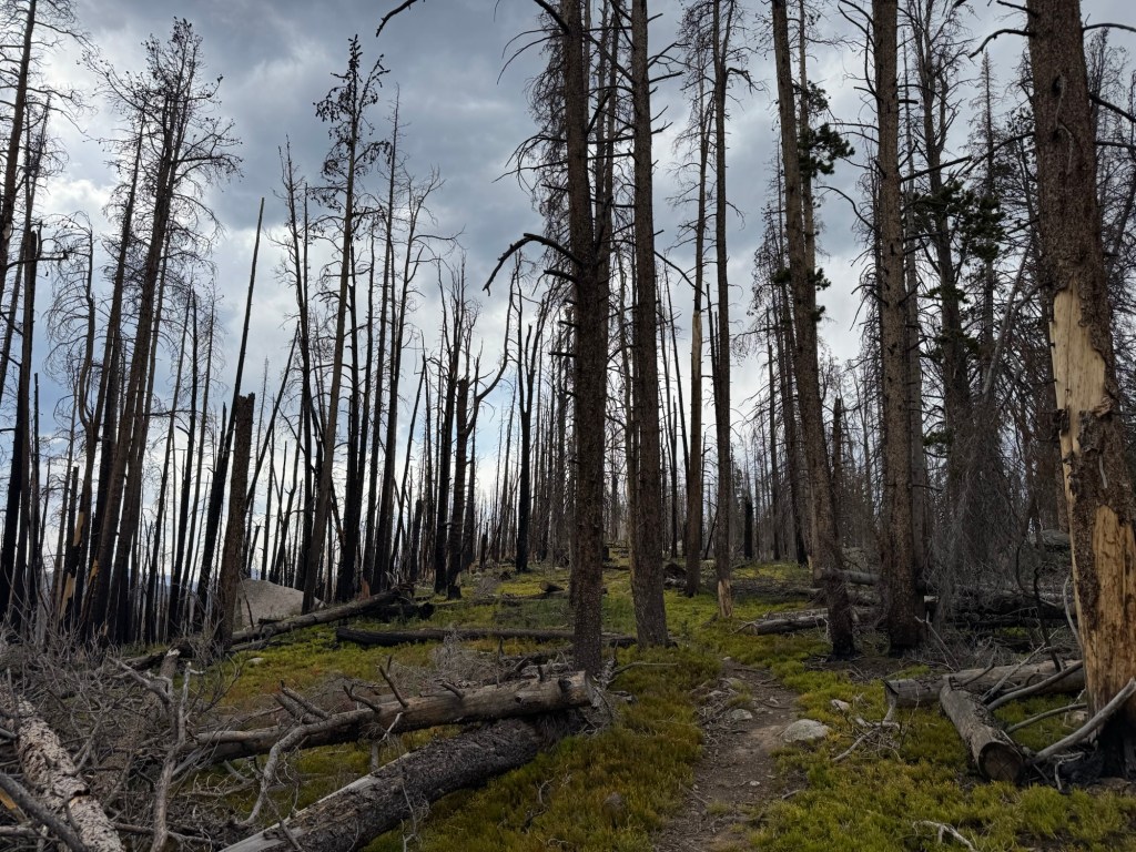 We left the trailhead and soon entered the Comanche Peak Wilderness, following Corral Creek as it gurgled through meadows and groves of pine. The air was heavy with the smell of damp earth and spruce, that rich, grounding scent that always makes me feel at home in the mountains. But soon the green gave way to the stark landscape of the burn zone. Charred trunks rose like dark pillars, evidence of fire’s fury, yet the absence of canopy opened sweeping views of the valley and distant ridges.