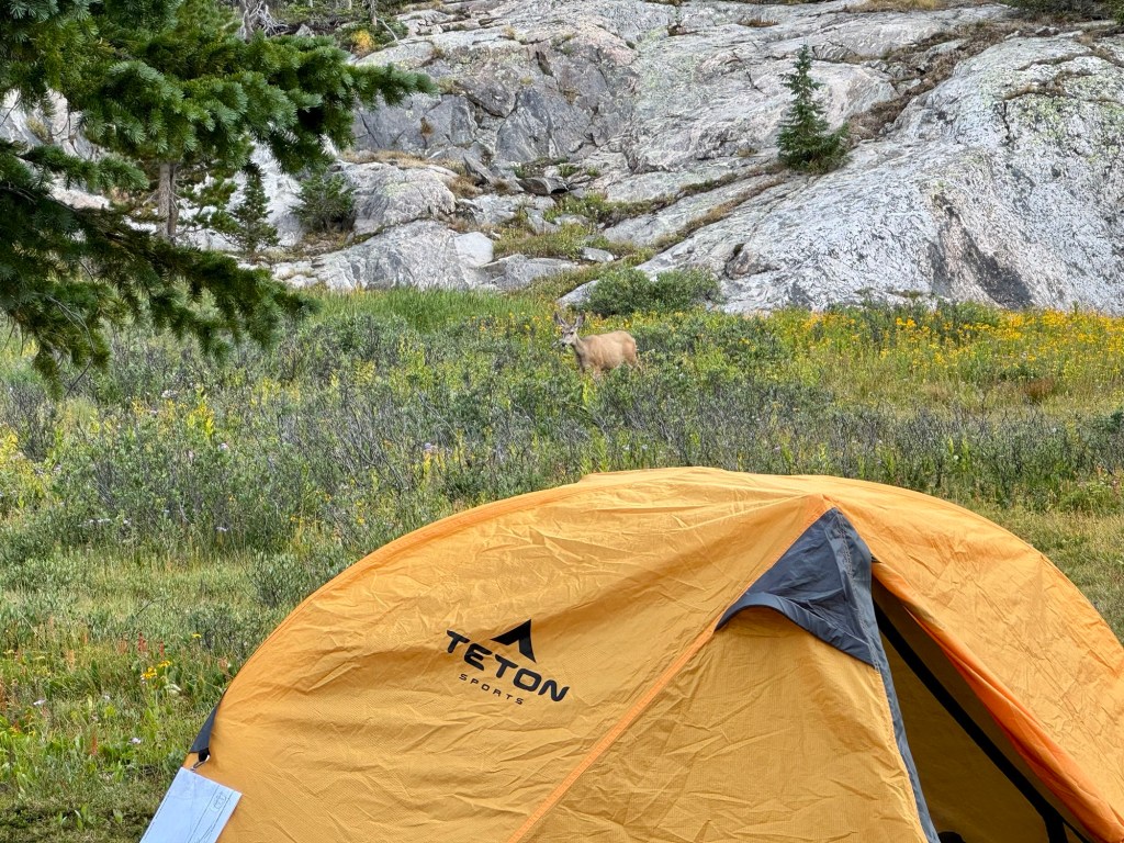 Morning came softly, sunlight brushing the mountain tips in gold while the meadow below slowly woke with color. The air was crisp but not biting, and I cradled my coffee mug as the scent of spruce and wet earth drifted through the meadow. Our little tents tucked beneath towering cliffs and nodding pines, the rhythm of creek providing the soundtrack to a peaceful mountain morning. A deer wandered nearby, grazing in the wildflowers with little concern for our presence—a quiet companion to breakfast.