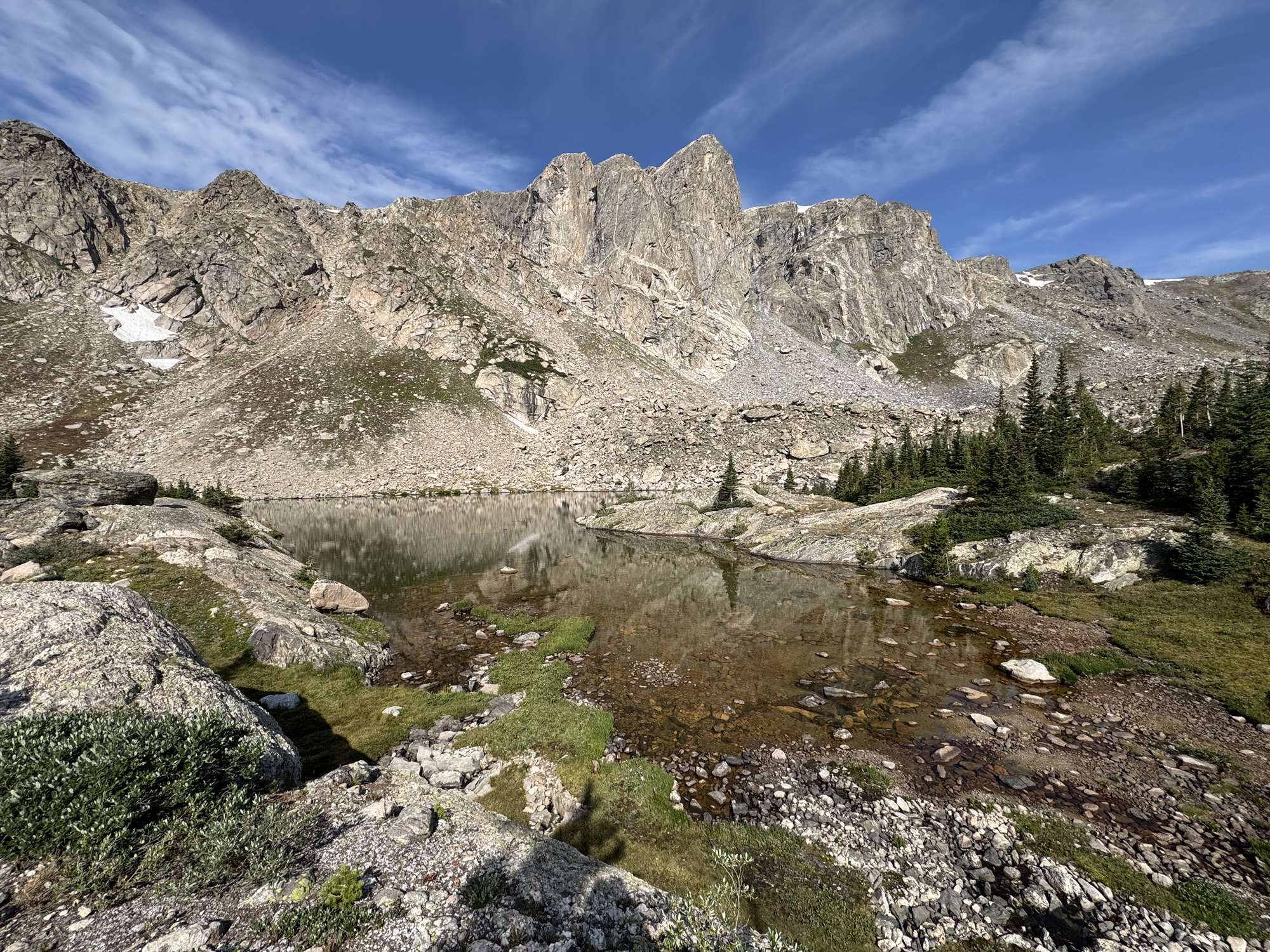 But we weren’t finished exploring. Skirting the shoreline, Greg and I scrambled over boulder fields and granite slabs until we reached Forever Pond, a hidden tarn perched just above Mirror Lake. Nestled in its rocky cradle, Forever Pond shimmered like a secret jewel—its green-tinged water so clear we could see straight to the bottom, yet still enough to reflect both mountain and sky. The outlet tumbled over boulders in a playful cascade before dropping toward Mirror Lake, connecting the two like a silver thread. Patches of alpine grass softened the granite edges, and snow lingered on shaded ridges high above. We lingered here, dipping our toes into the cool water, climbing to a nearby ridge to capture views of both lakes sparkling below.