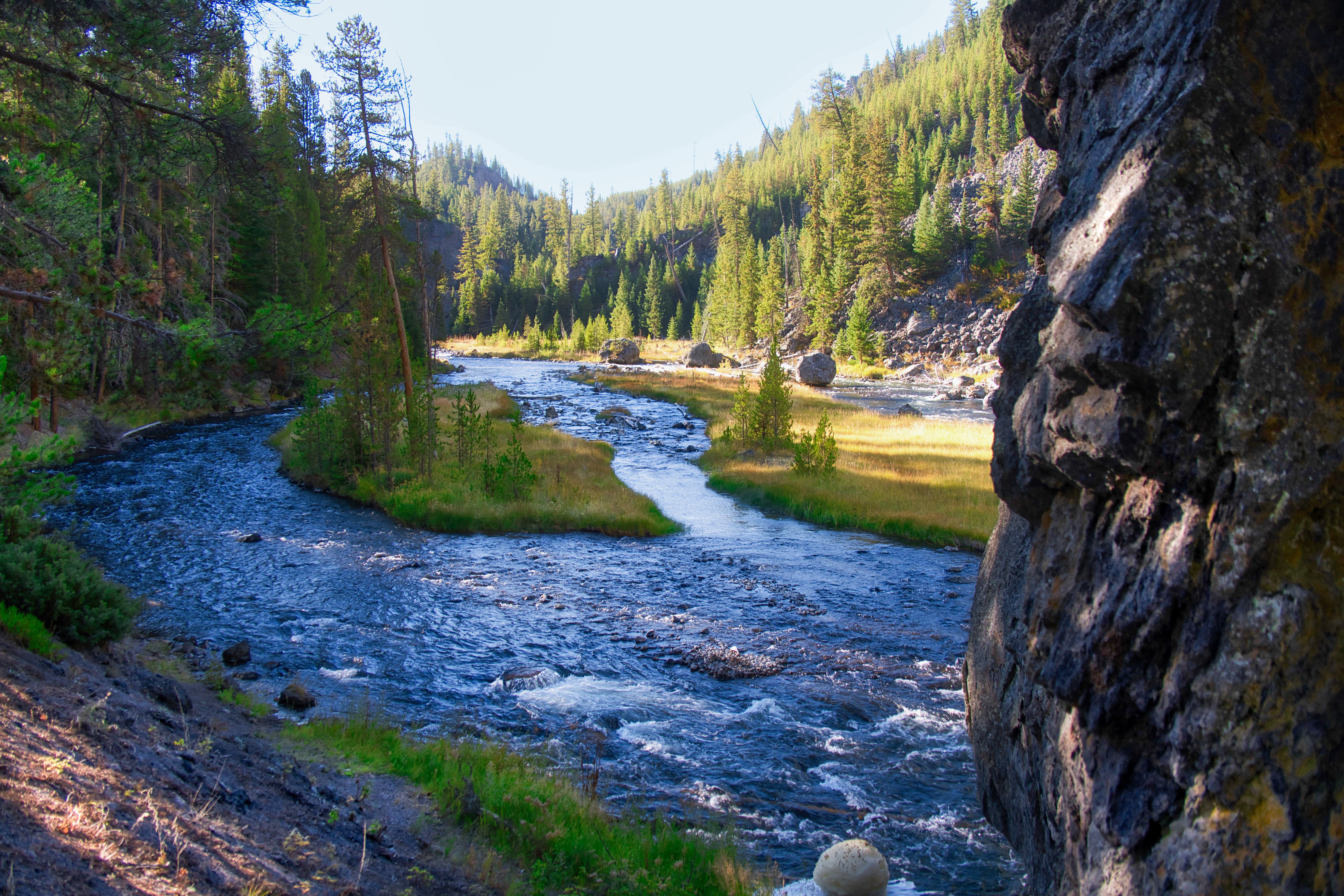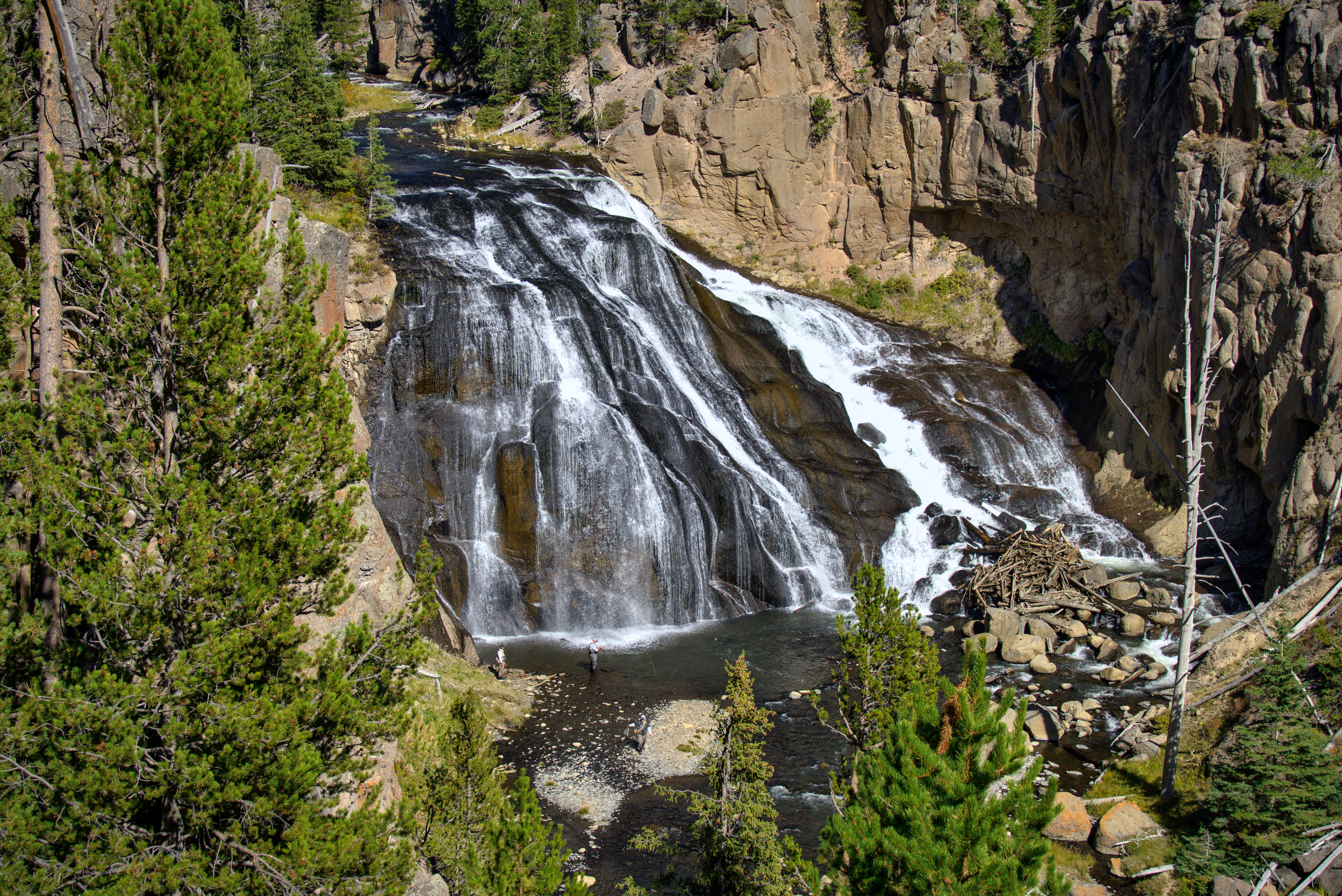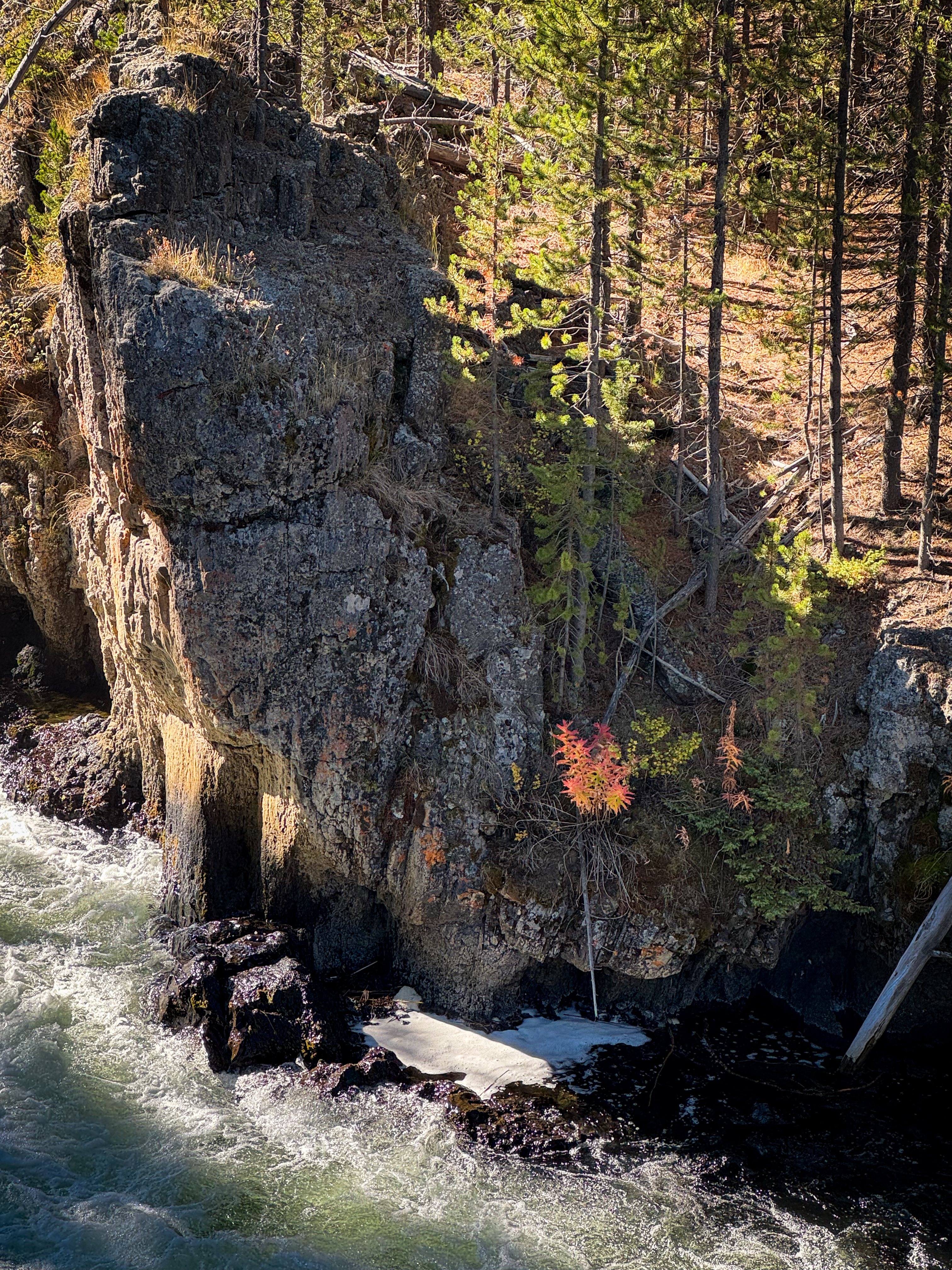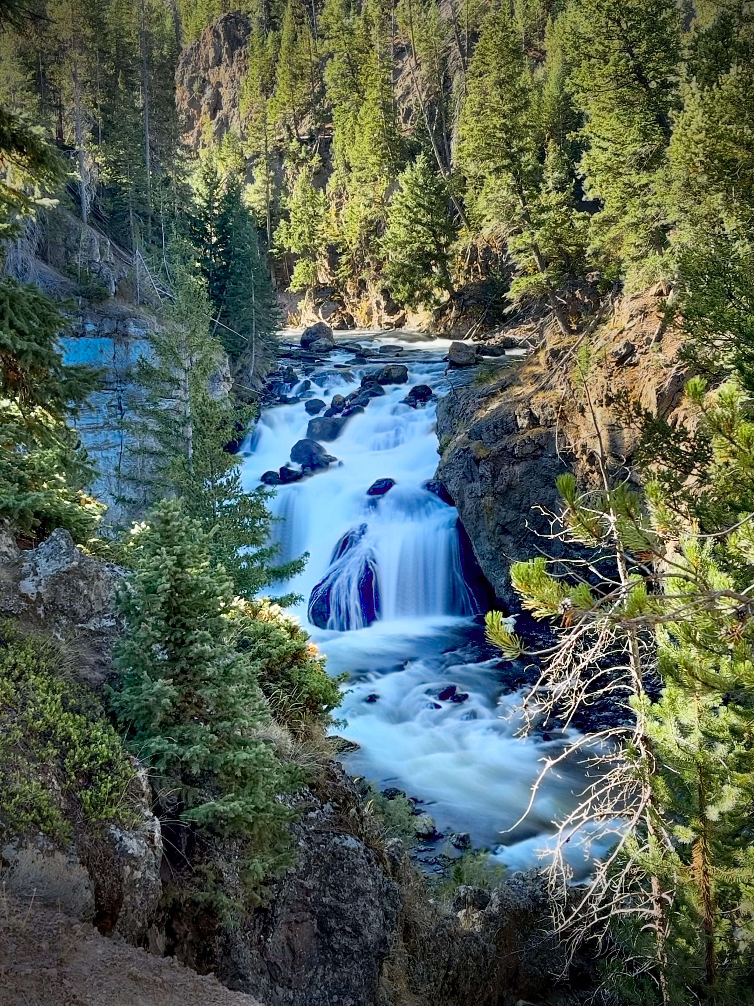 The next morning was brisk, our breath visible in the cool air, but we knew the sun would soon warm the park. Our first full day in the park began at Firehole Canyon Drive, where the Firehole River wound through walls of volcanic rock. The morning light danced across the water, softening the edges of the rugged cliffs. At Firehole Falls, the river thundered over black lava rock, a cascade both fierce and beautiful.