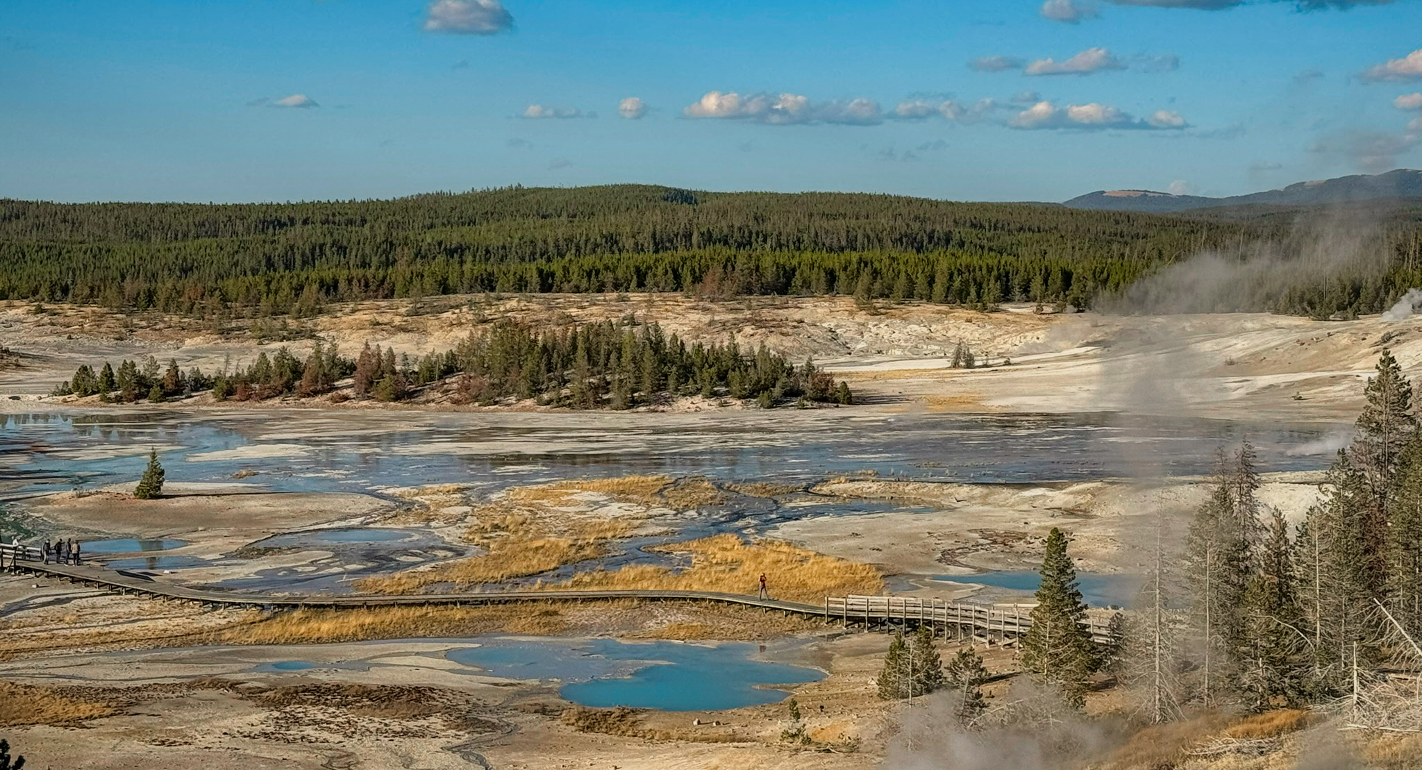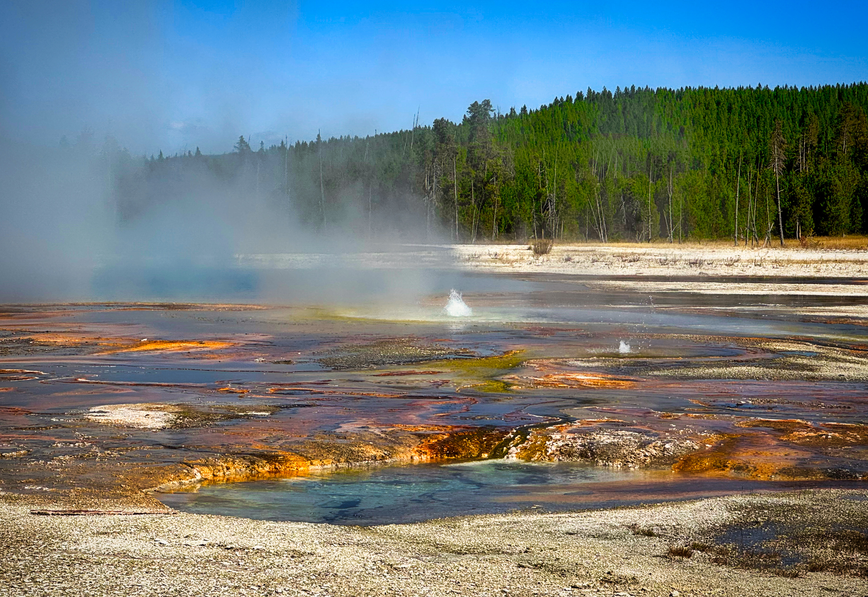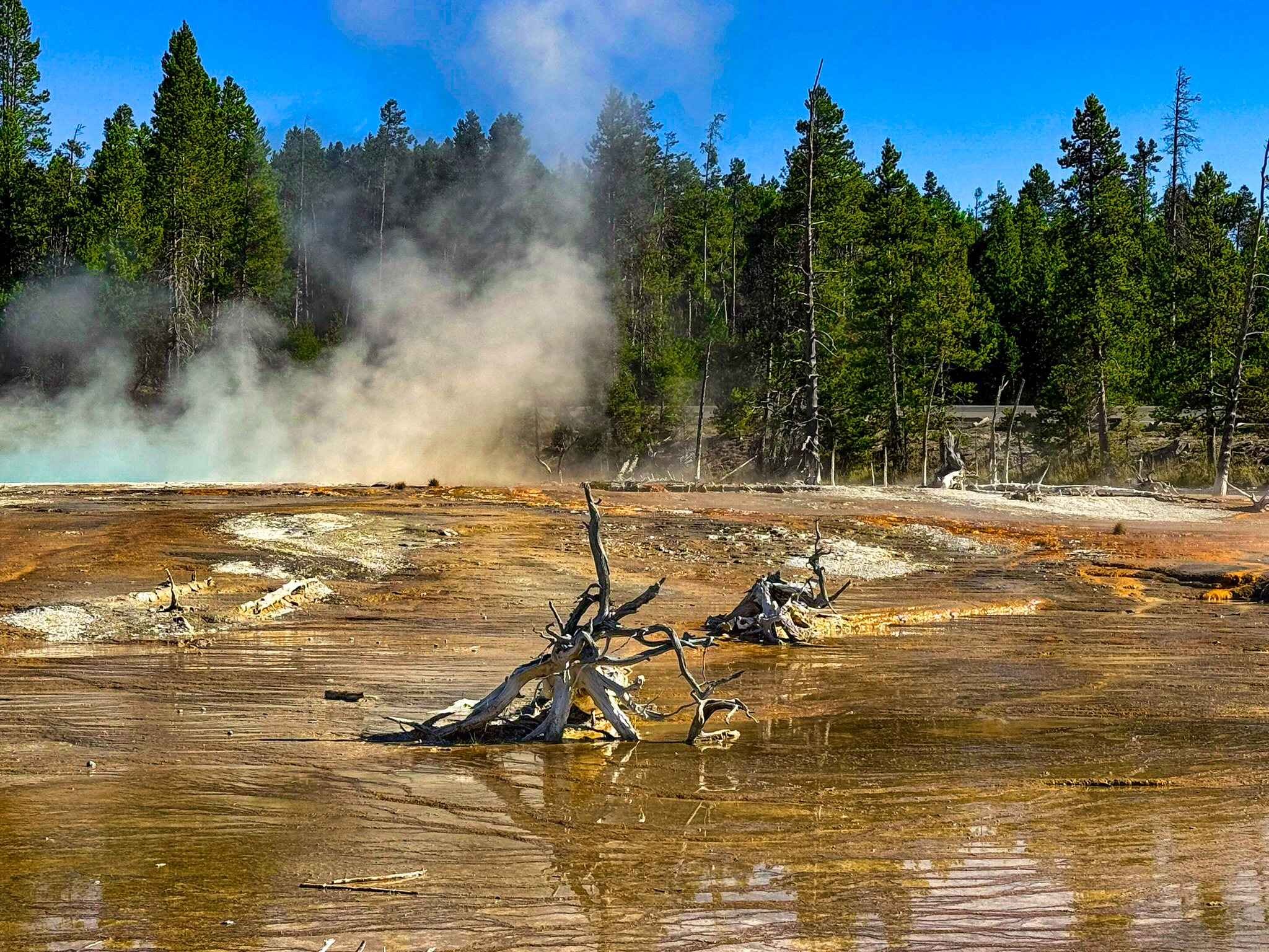 Though evening crept in, we made one last stop at Norris Geyser Basin, Yellowstone’s hottest and most changeable geothermal area. The boardwalk carried us through an alien landscape—vivid pools reflecting the sky, steam hissing in every direction. At Steamboat Geyser, the tallest geyser in the world, we lingered to watch it bubble and sigh, releasing bursts of water and vapor that hinted at the incredible force lying beneath. Bathed in the glow of the setting sun, the basin felt ethereal, a dreamlike finale to a full day.