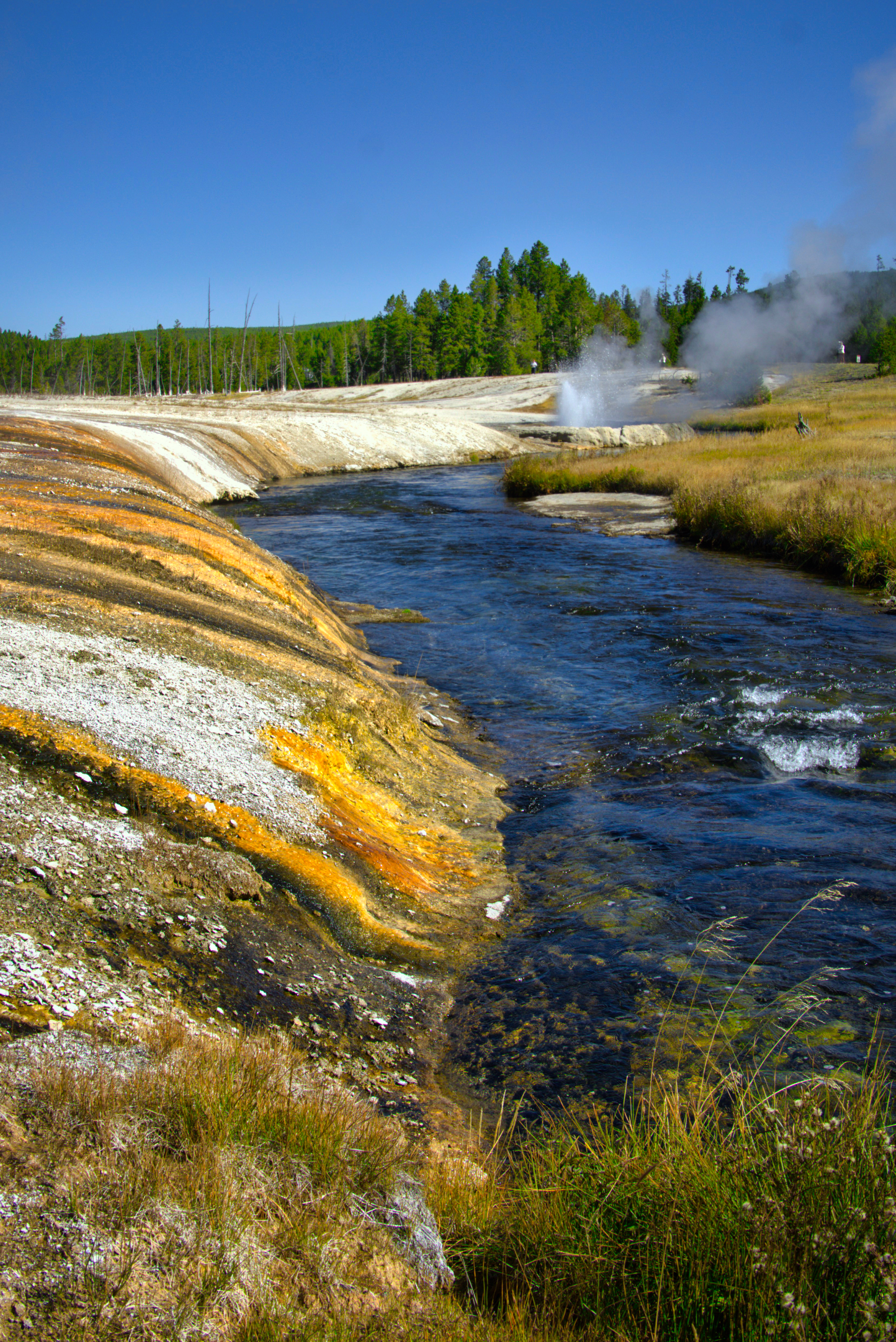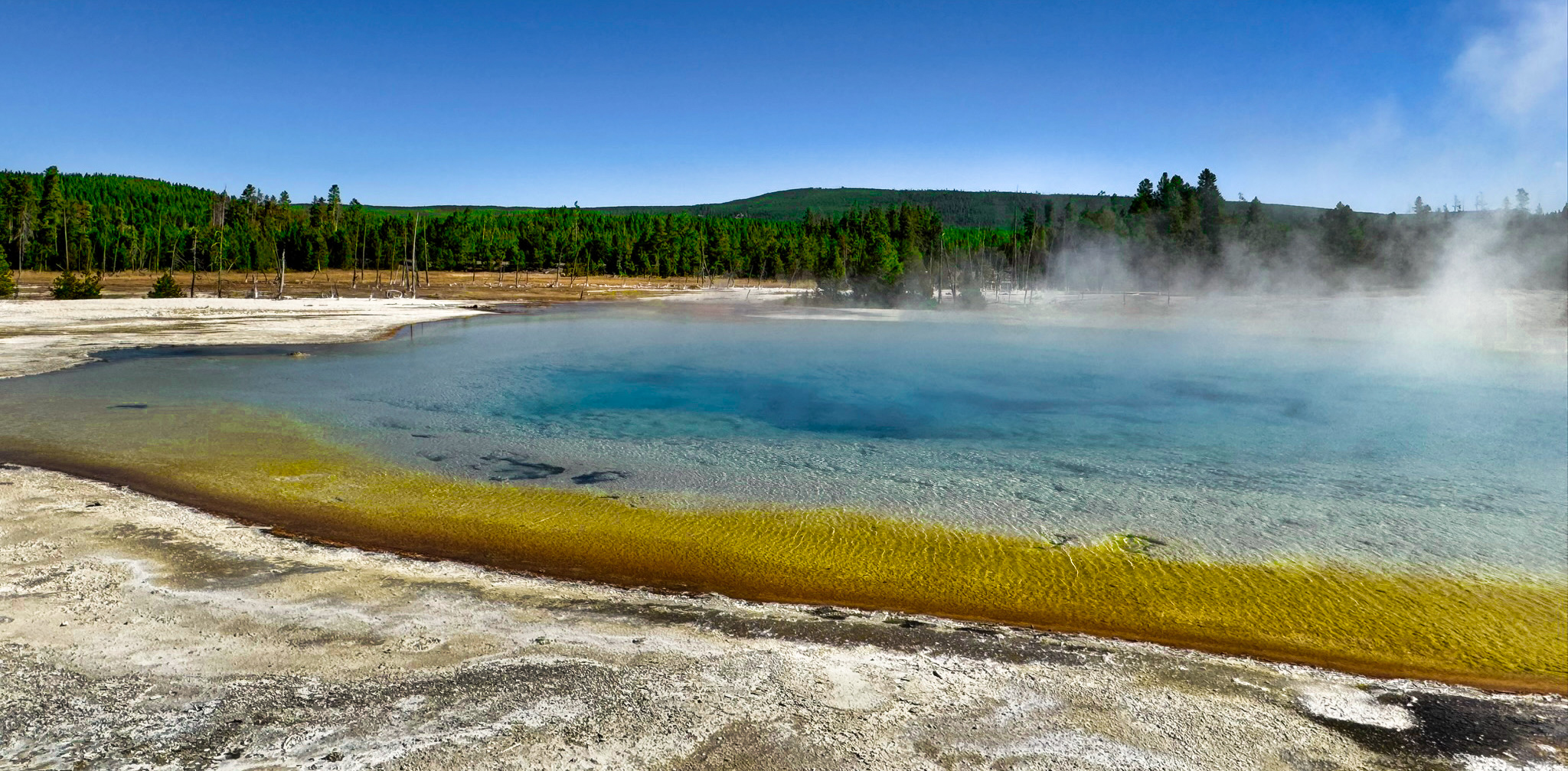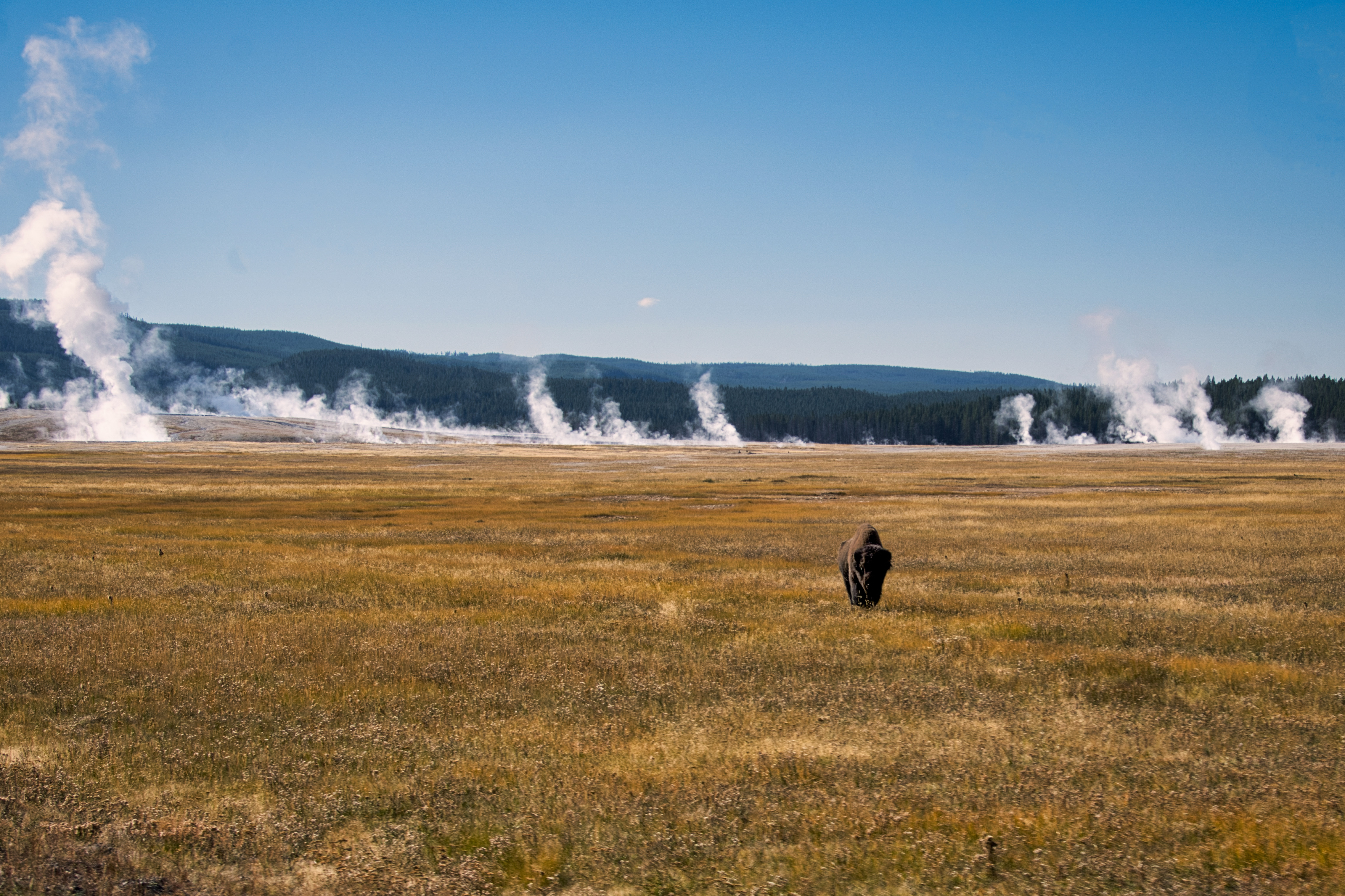 Though evening crept in, we made one last stop at Norris Geyser Basin, Yellowstone’s hottest and most changeable geothermal area. The boardwalk carried us through an alien landscape—vivid pools reflecting the sky, steam hissing in every direction. At Steamboat Geyser, the tallest geyser in the world, we lingered to watch it bubble and sigh, releasing bursts of water and vapor that hinted at the incredible force lying beneath. Bathed in the glow of the setting sun, the basin felt ethereal, a dreamlike finale to a full day.