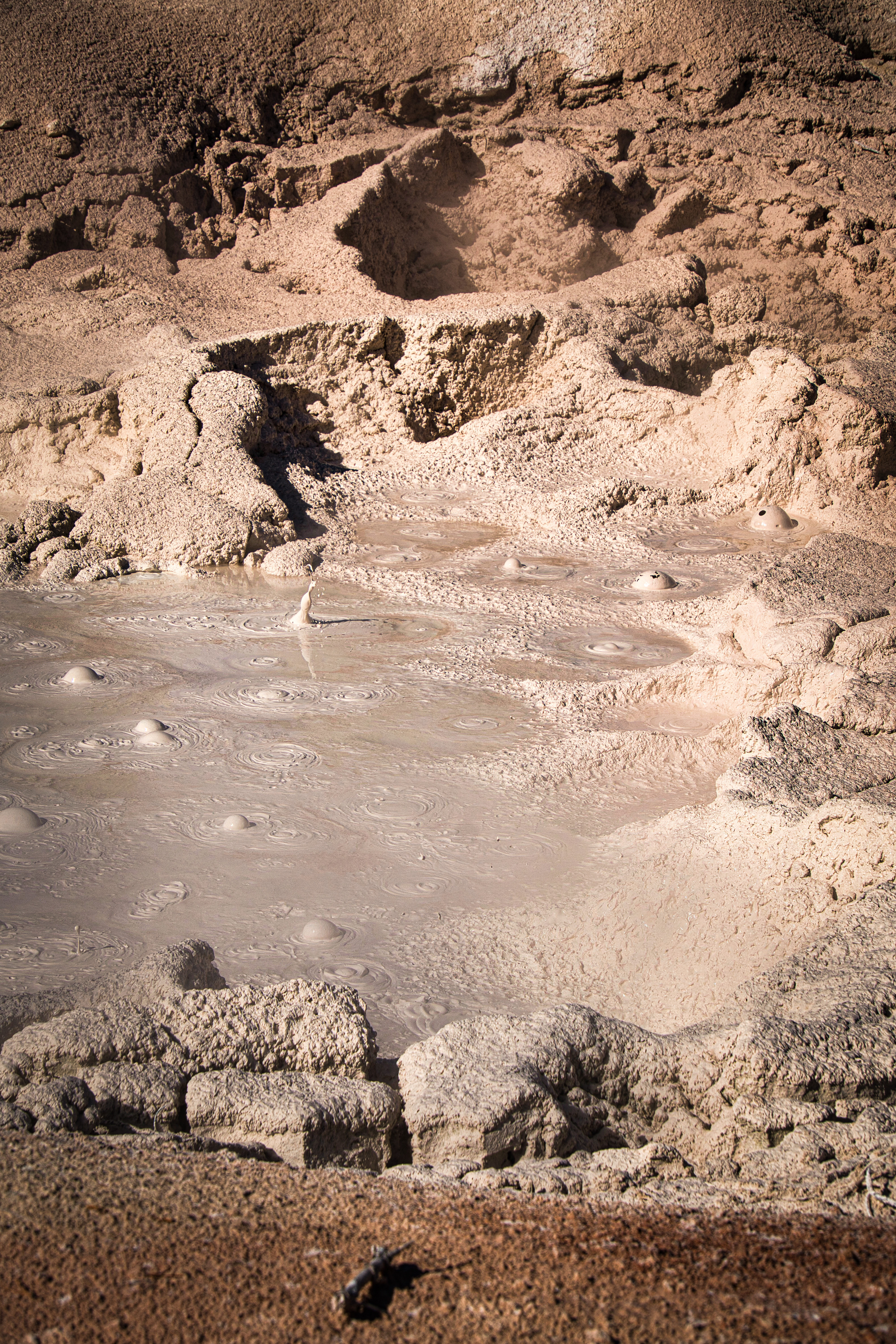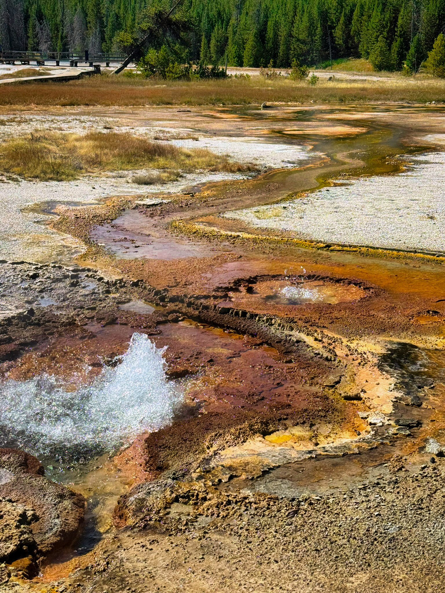 From there, we wandered the boardwalk at Fountain Paint Pots in the Lower Geyser Basin, where Yellowstone’s geothermal world came alive all at once. Steam rose in thick clouds, hissing from vents. Mud pots bubbled and burped, thick clay popping like nature’s stew. Pools shimmered in surreal shades of blue and green, each one its own portal into the earth’s fiery heart.