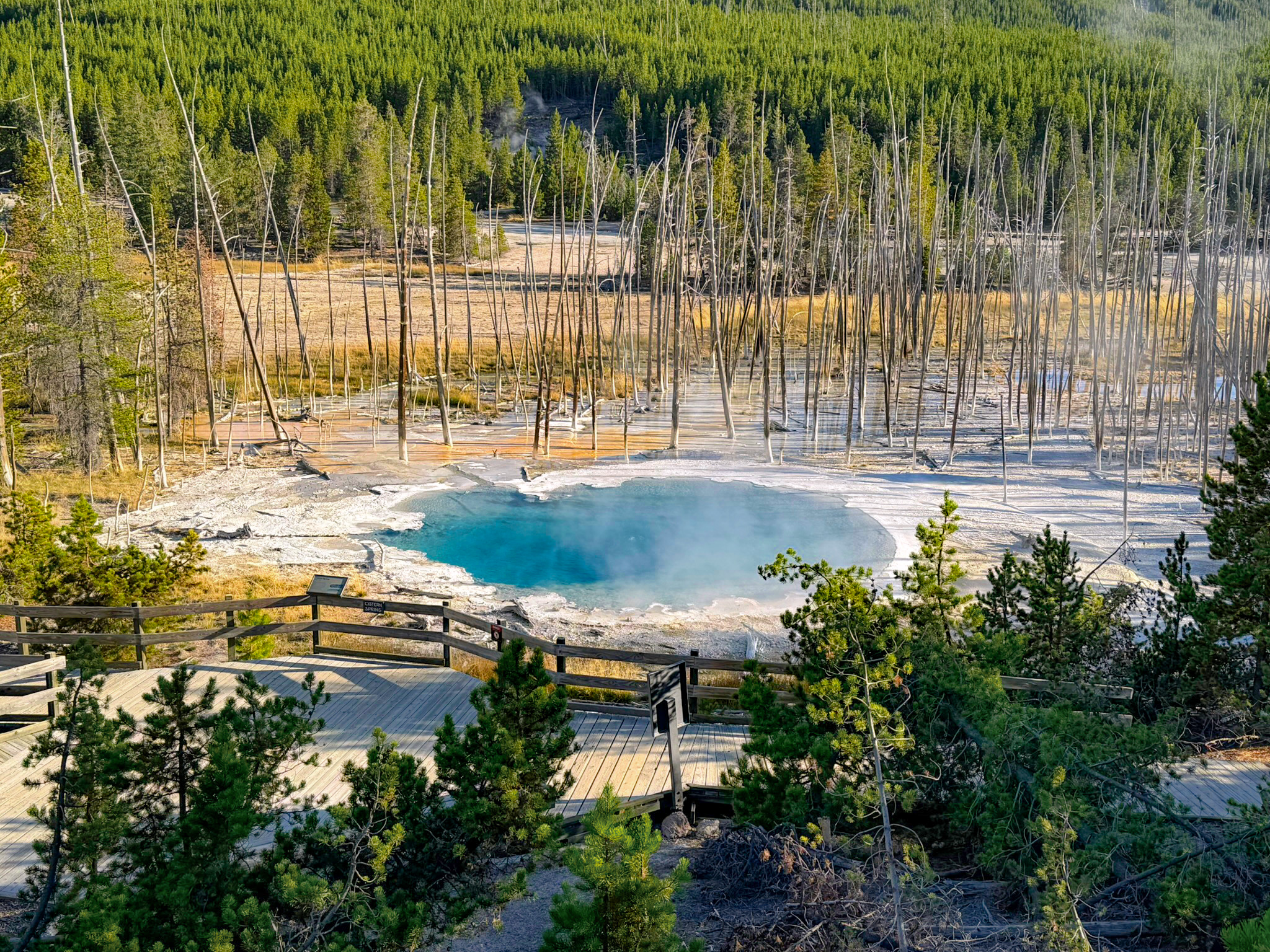 Next, we explored the colorful treasures of Black Sand Basin. Fiery Sunset Lake rippled with steam, while the brilliant Emerald Pool glowed in shades of deep green and gold. Tucked close together, these springs felt like jewels scattered across the basin floor.