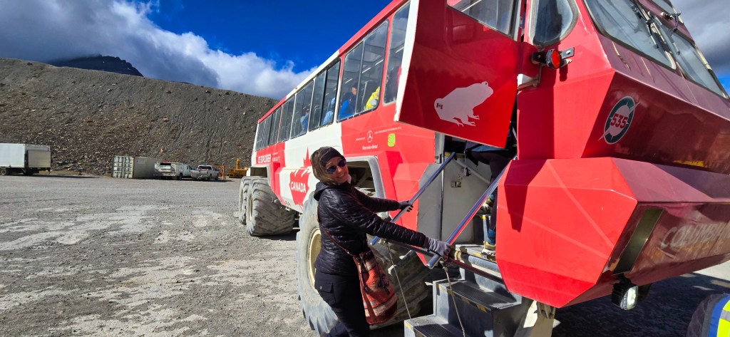 At the Icefield Discovery Centre, we boarded one of the massive red-and-white Ice Explorer buses—its tires taller than we were, custom-built for the steep, rugged road leading onto the Athabasca Glacier. The descent to the ice was astonishingly steep, with grades reaching up to 36%, so sharp that the driver joked it was one of the steepest commercial roads in North America. When we finally rolled onto the glacier, the cold struck like a wall. I was grateful for my microspikes as we stepped out into the wind—wild, relentless gusts that whipped across the ice, rattling jacket zippers and numbing fingers. Some people struggled to stay upright as the gusts swept over the slick surface, but I stood steady, transfixed by the view. Before us stretched a world of shimmering white and glacial blue—ancient, immense, and alive beneath a restless sky.