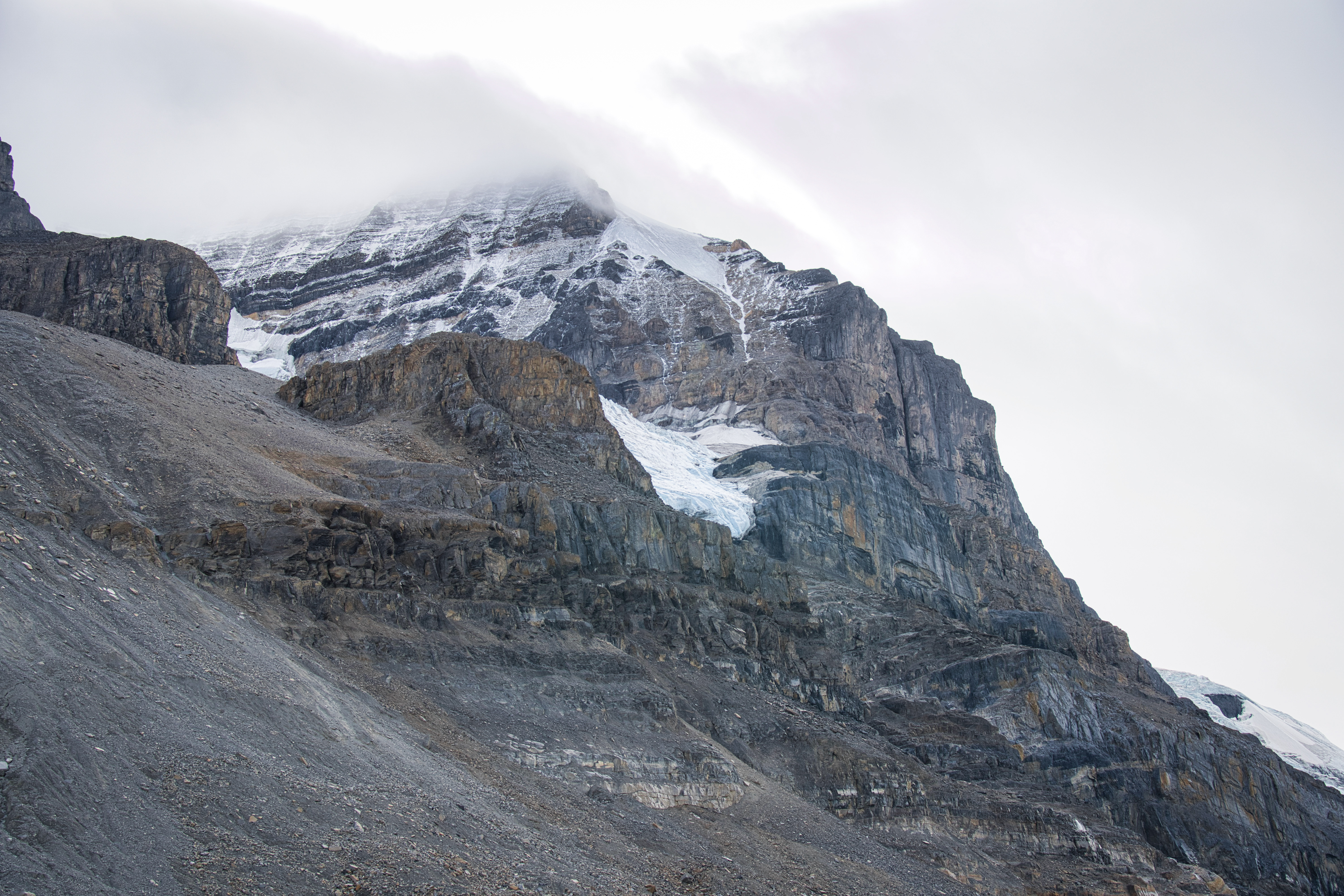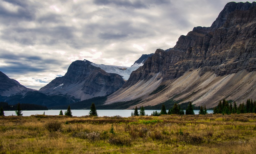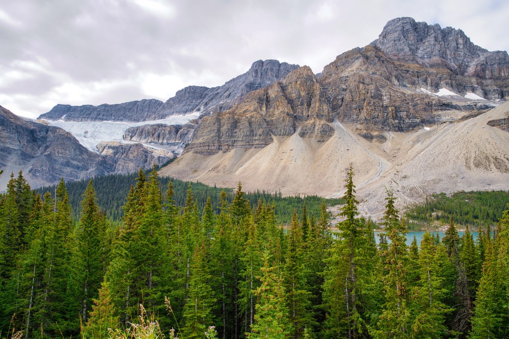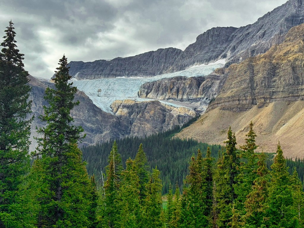 Our first stop was Bow Lake, quiet and subdued beneath a blanket of gray clouds. The usual turquoise brilliance had softened to a cool slate blue, mirroring the muted light of the morning sky. The air carried the crisp edge of glacier melt, and the stillness of the valley felt almost reverent. Across the water, the rugged walls of Crowfoot Mountain rose sharply, with Crowfoot Glacier draped along its slopes—a frozen remnant of an earlier age. Once shaped like a three-pronged crow’s foot, only two “toes” remain today, a striking reminder of how even ice and stone slowly yield to time. Yet even in its changed form, it stood as a monument to endurance, a frozen echo of the past.
