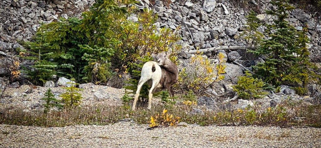 Just beyond a bend, the calm was broken by movement—a mother bighorn sheep and her young lamb trotting confidently along the roadside. They moved with such ease, sure-footed even on the uneven shoulder, their coats blending perfectly with the muted tones of rock and brush. The lamb paused to nibble on low shrubs while the ewe stood watch, unbothered by the few cars that had slowed to admire them. It was one of those moments that reminded us: the Icefields Parkway isn’t just a road through mountains—it’s a road through their living, breathing story.