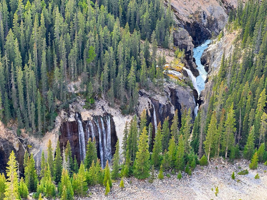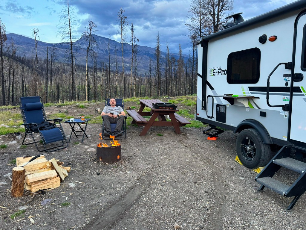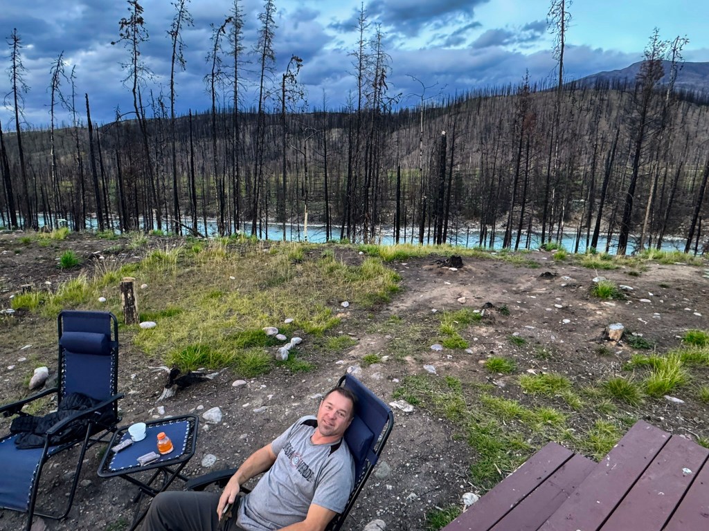 When we reached Wapiti Campground, the rhythm of the day softened. Our site backed up to the Athabasca River, its glacial waters rushing steady and cold behind the trees. As we set up camp, the air filled with the scent of pine and woodsmoke, and the sound of the river blended with the low crackle of our fire. Surprisingly, the evening was warm, and I cozied up in a blanket more for comfort than for the cold—content to simply sit and listen as the water whispered through the dark.