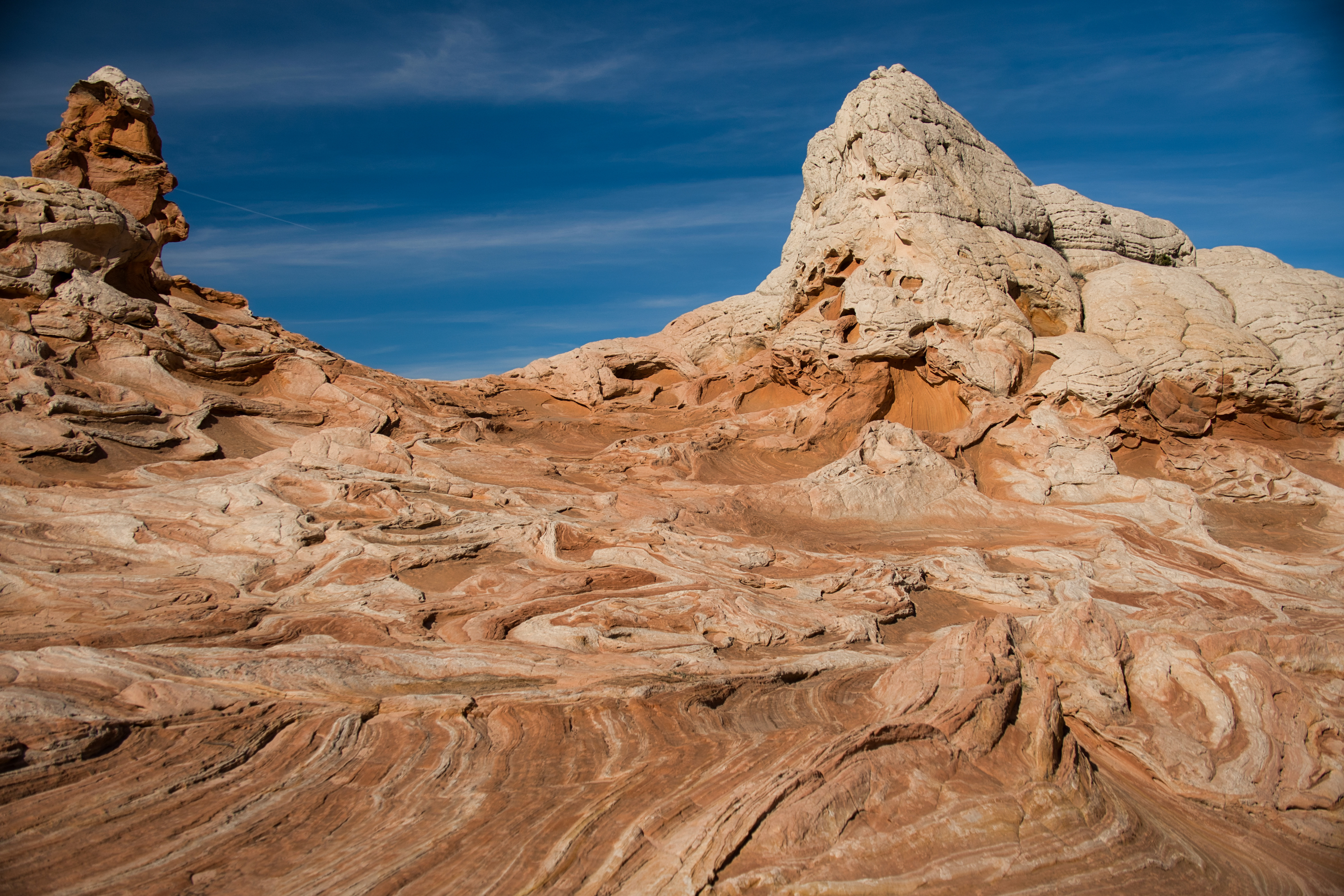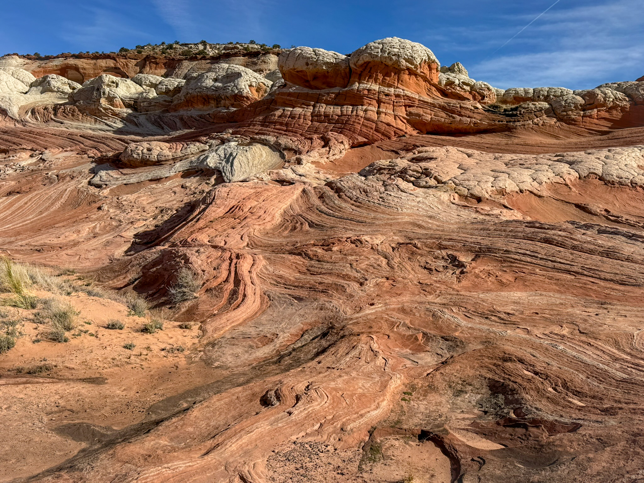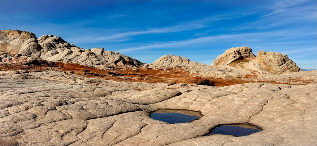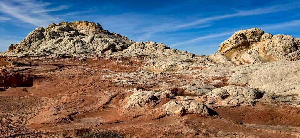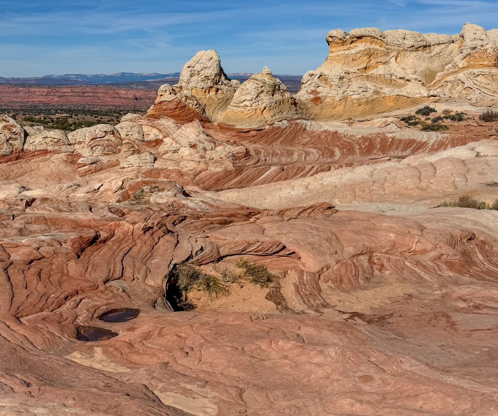 White Pocket spread out before us in waves of pale sandstone, sculpted into domes, folds, and bulbous shapes that looked like they had been poured rather than carved. Ribbons of red, peach, and buttery yellow curled through the rock like marbled clay, blending and separating in patterns that felt almost fluid. The stone rose and dipped in frozen motion, as if the whole landscape had been caught mid-swirl by some ancient force.