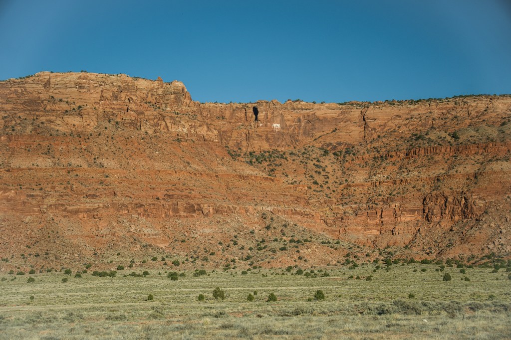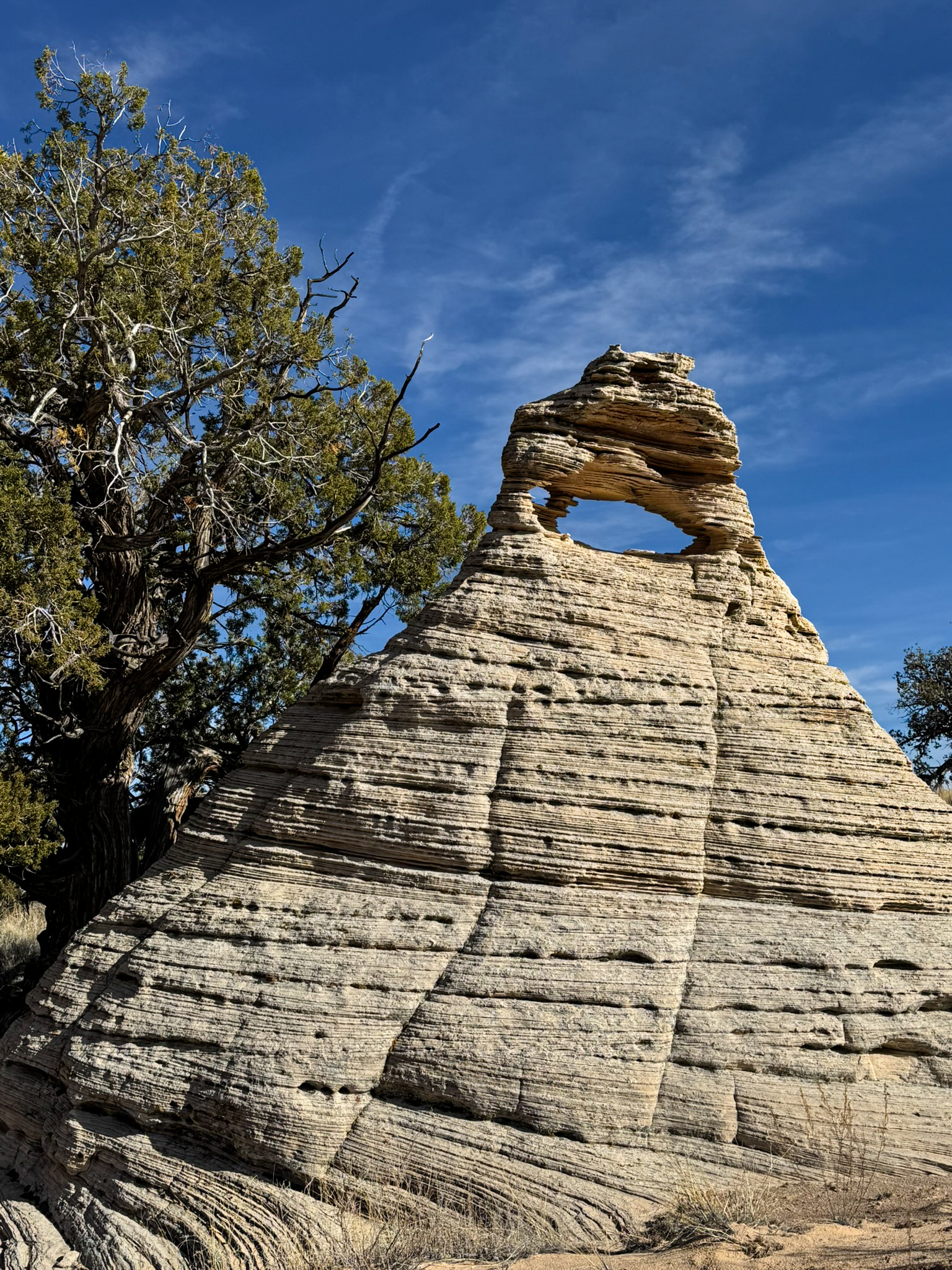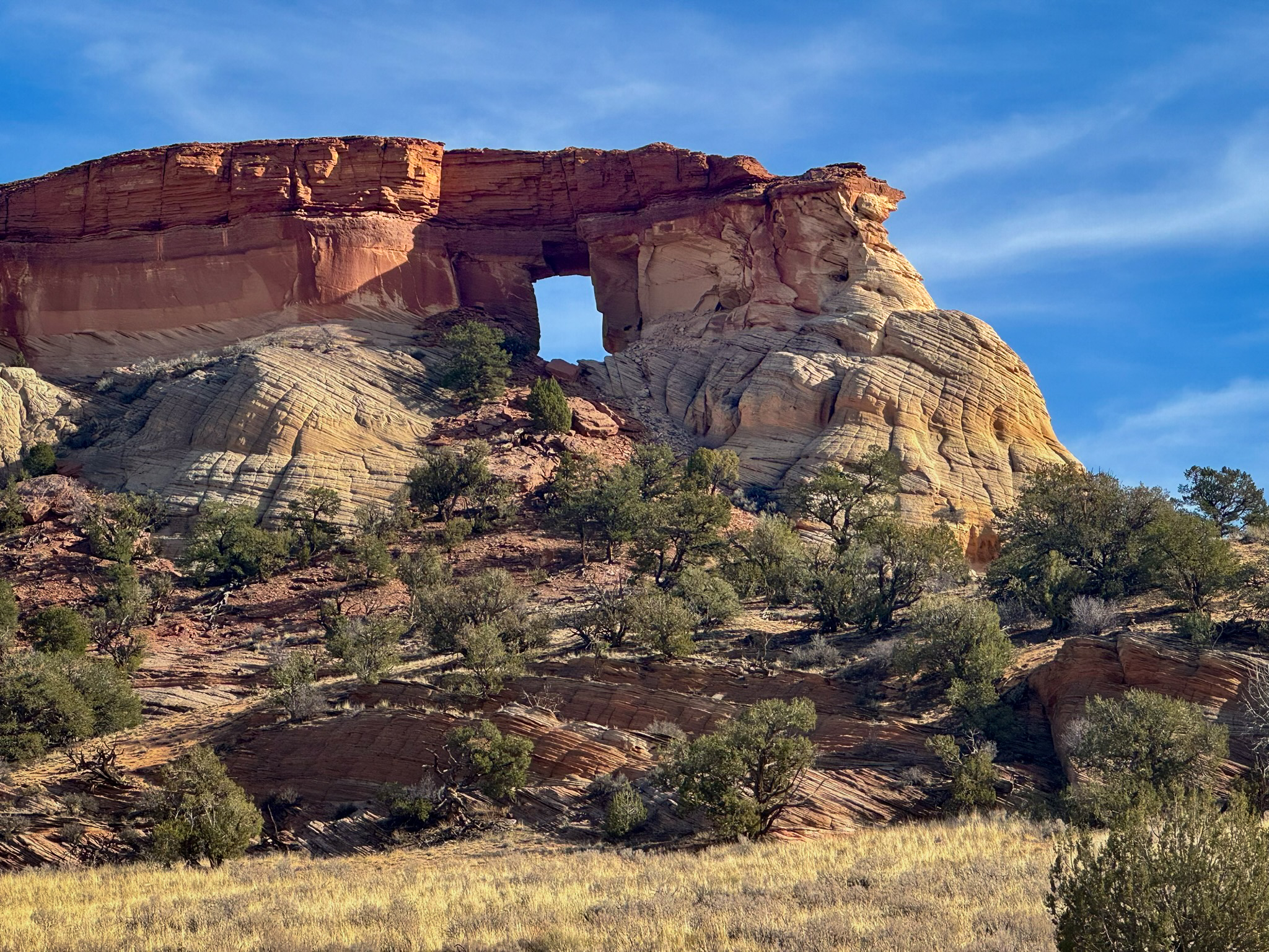 A short, sandy drive carried us onward, the road weaving between juniper stands and pastel-striped buttes. Before long, a small arch appeared on the horizon, a delicate window carved into a lone sandstone pinnacle. We jokingly named it “Baby Hole-In-The-Rock,” a tiny echo of what we were seeking.