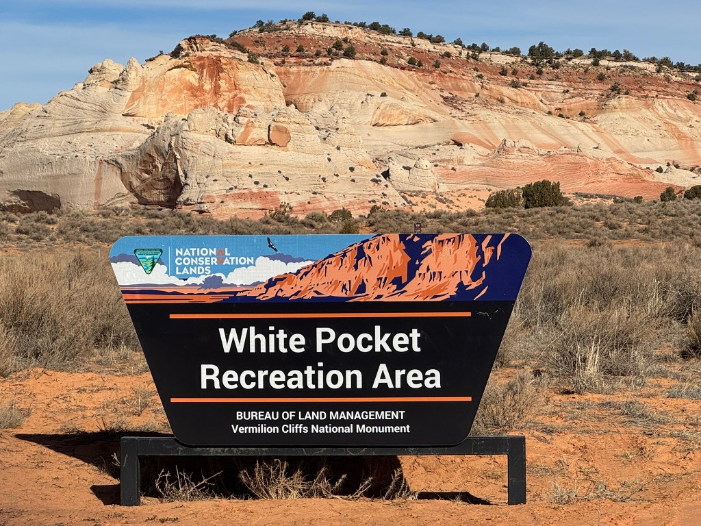But the morning was beautiful—the sky a flawless blue, temperatures hovering in the mid-50s, and a silence so complete it felt like its own landscape. As the miles rolled on, the first hints of White Pocket appeared: pale stone rising abruptly from the desert floor, like a monolith surfacing from another world. And then, finally, the sign we’d been waiting for: White Pocket Recreation Area, standing proudly against a backdrop of swirling sandstone.