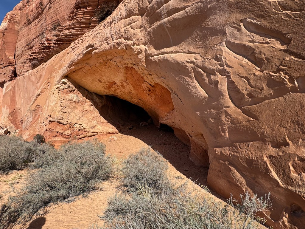 Nearby, we wandered into an Ancestral Puebloan rock shelter tucked beneath a sweeping alcove. Faint petroglyphs were etched across the sandstone wall—deer, shapes, and lines softened by centuries of wind and time. Inside the alcove lay a scatter of artifacts: pottery shards, tiny bones, nutshells, stone flakes, even what looked like remnants of ancient corn.