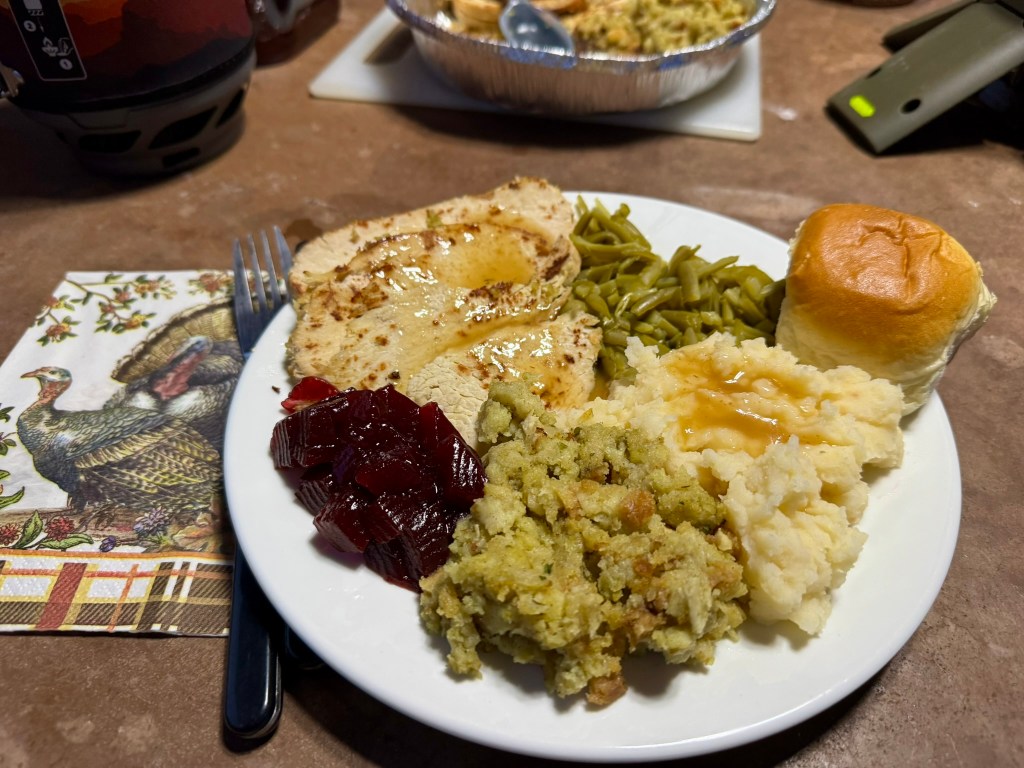 Back at camp, we pulled together our full Thanksgiving dinner, made possible thanks to all the prep we had done at home. Turkey, stuffing, mashed potatoes, green beans, cranberries, warm rolls… and yes, apple pie for dessert, because some traditions simply shouldn’t be skipped, even in the backcountry.