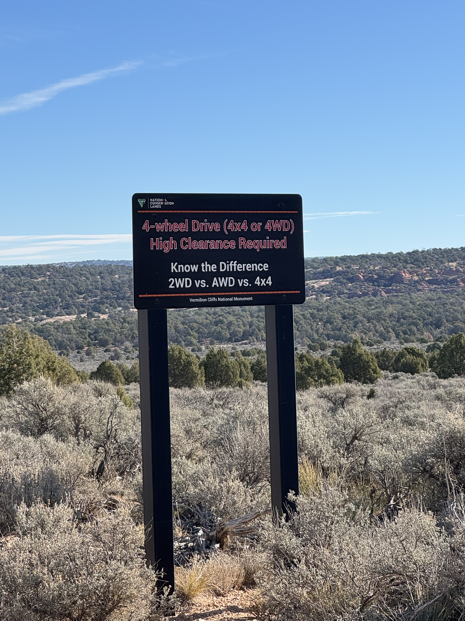 After breakfast, we pointed the Jeep toward White Pocket, a destination that’s as much about the journey as the destination itself. Turning onto BLM 1087, we passed the familiar warning sign: 4×4 High Clearance Required. Out here, those signs aren’t suggestions. Conditions shift constantly in the desert; what’s passable one day can swallow tires the next.