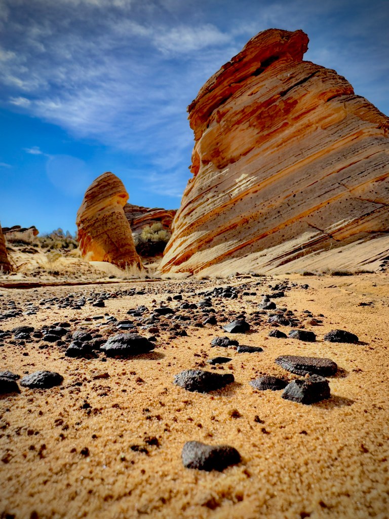 Scattered across the sand were moqui marbles—smooth, dark iron concretions that looked almost otherworldly against the pale stone. They gathered in small clusters like beads spilled from an unseen hand, tiny relics of geological alchemy formed over millions of years. Walking among them felt like moving through a quiet gallery of the desert’s oldest work.