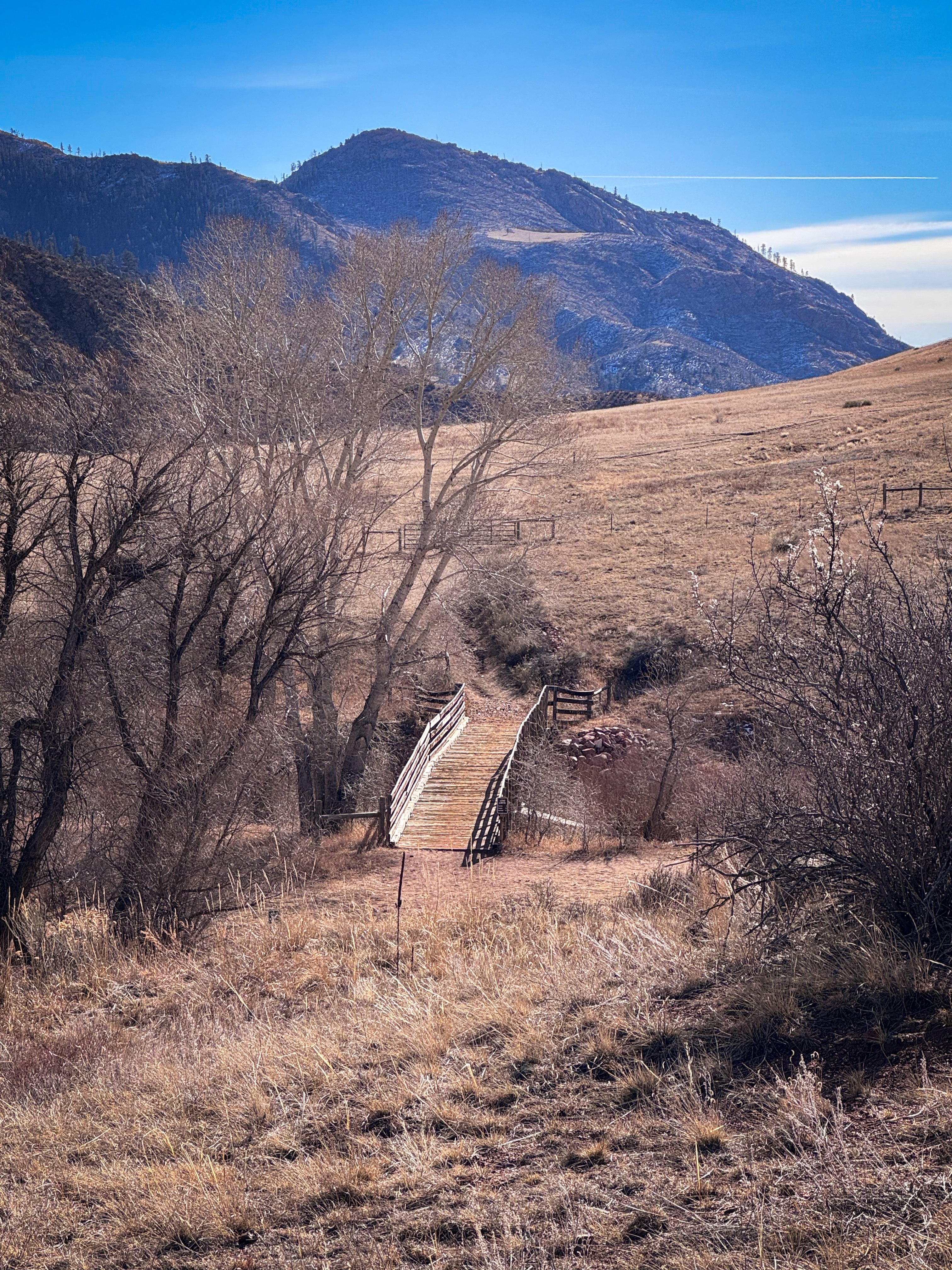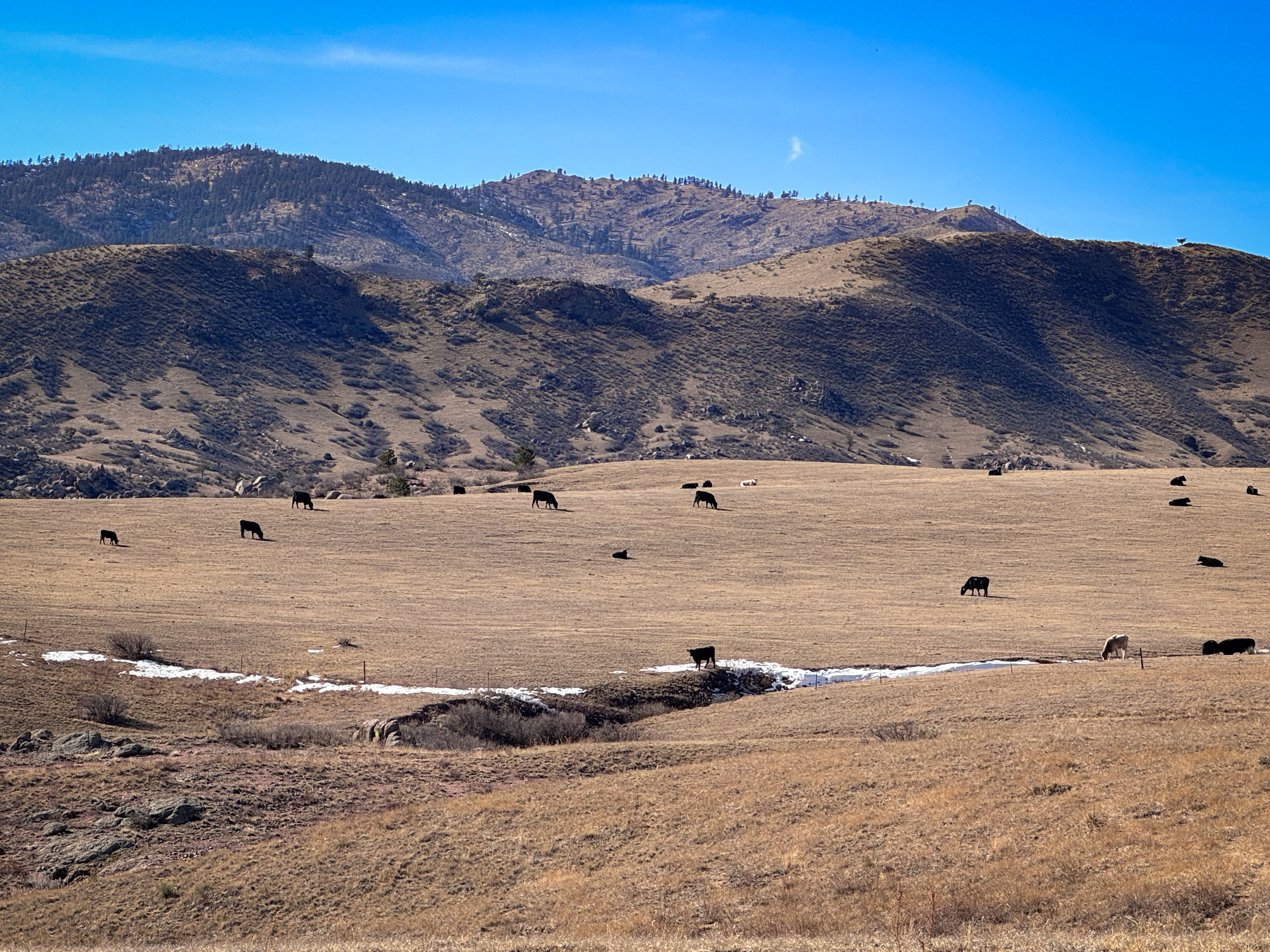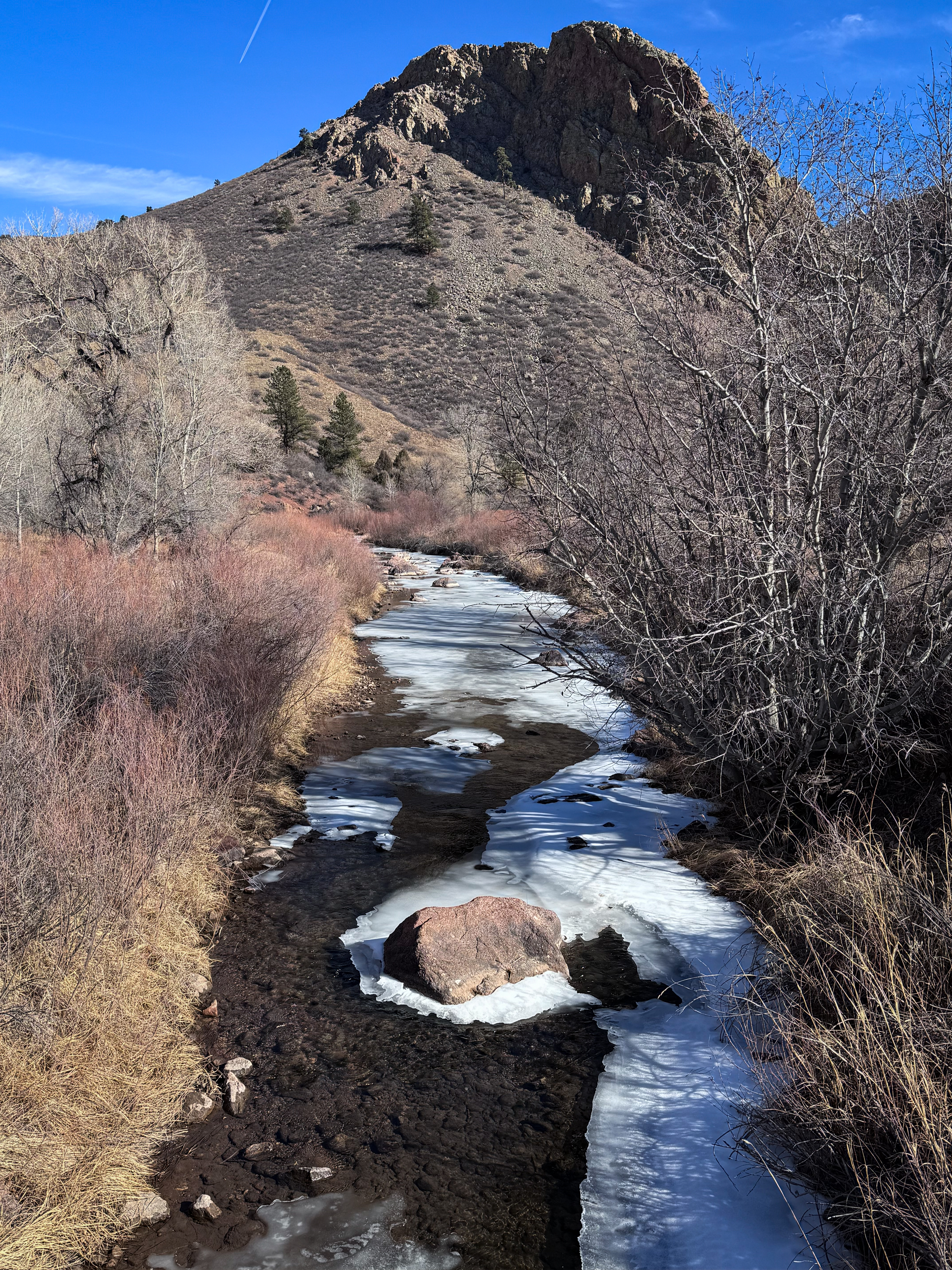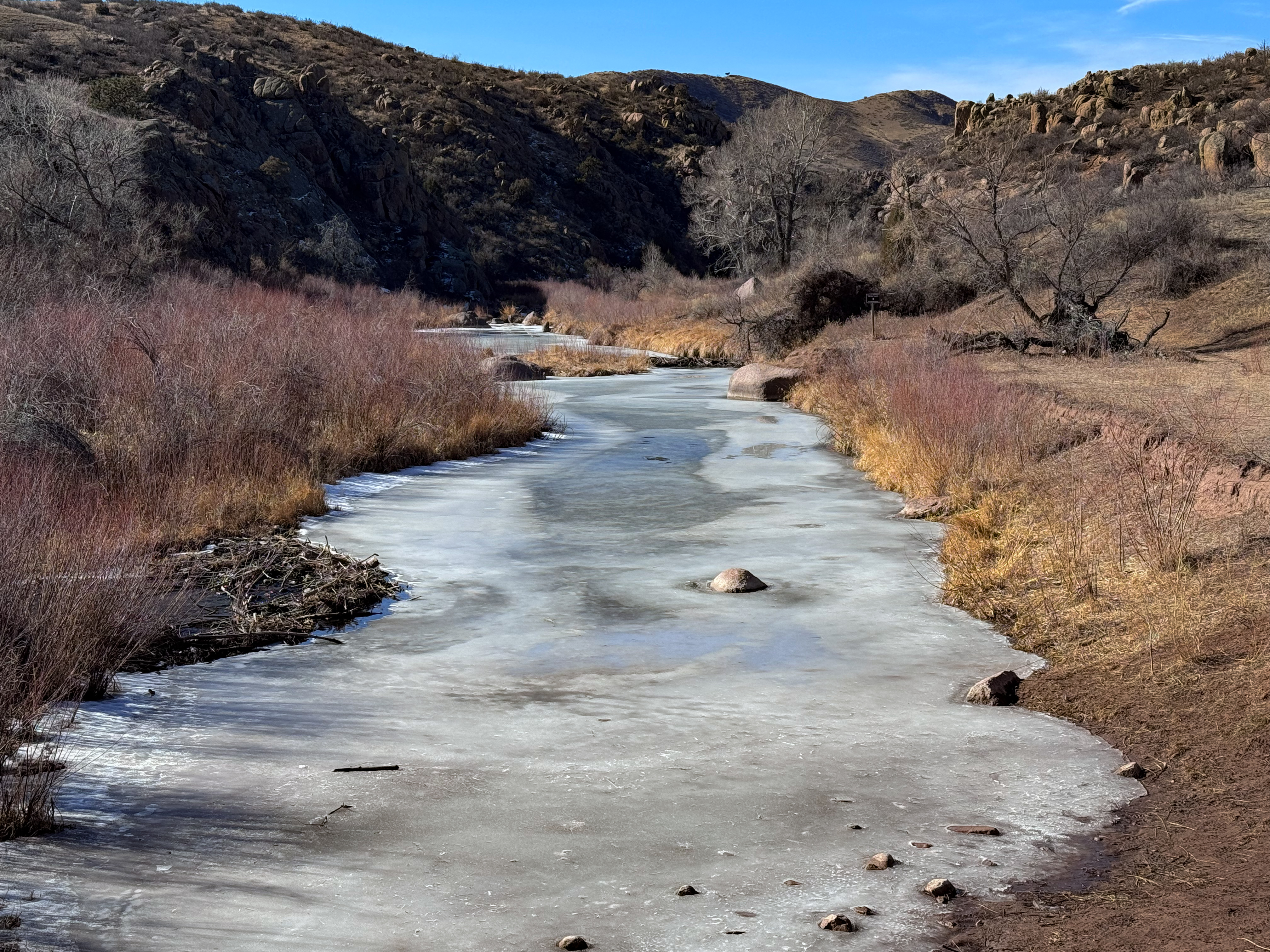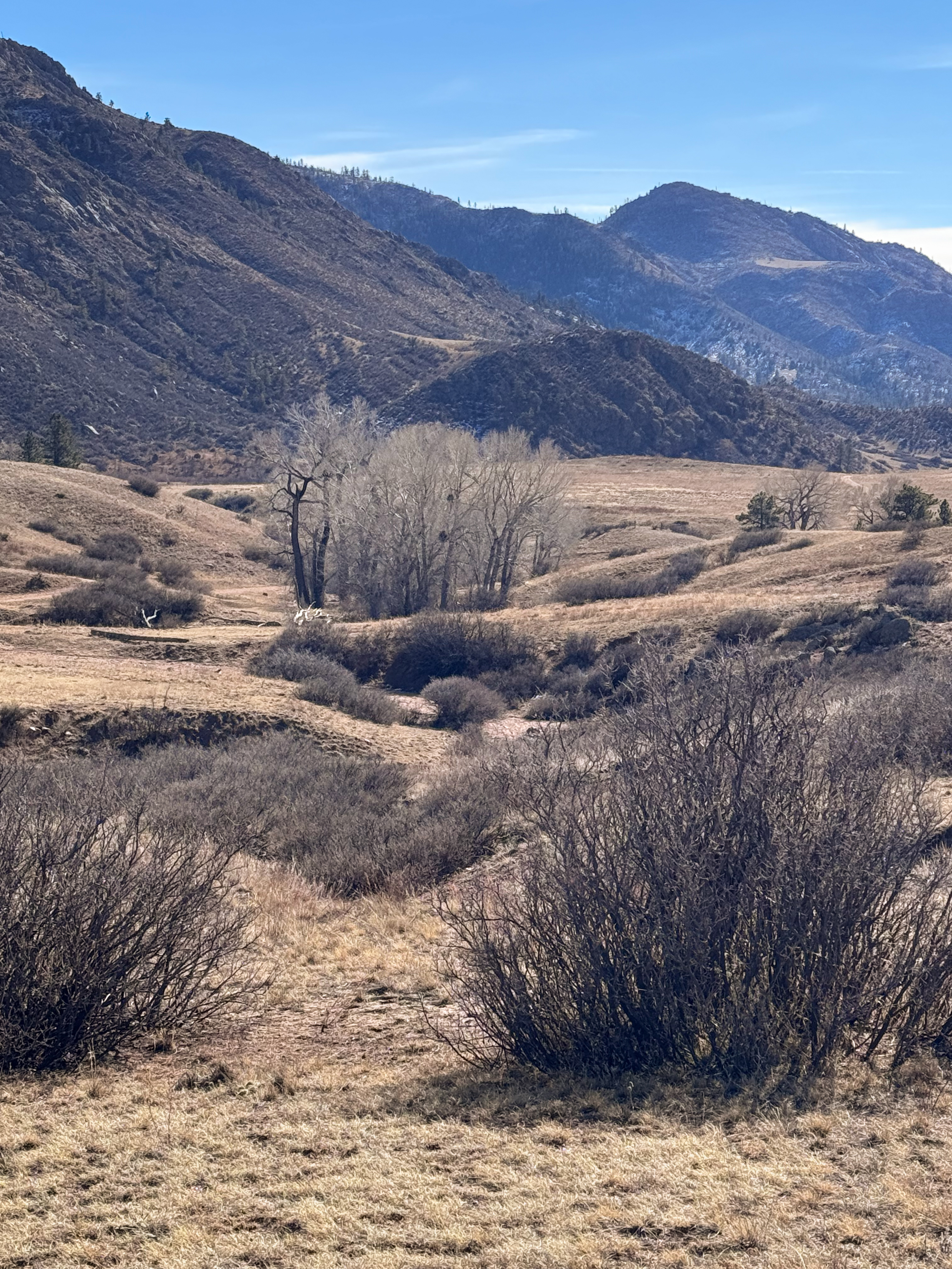 Cutting through the open space is the North Fork of the Cache la Poudre River, winding gently through cottonwoods and willows. Even partially frozen, the river brings a sense of movement and life to the valley — a quiet contrast to the stillness of the surrounding hills.