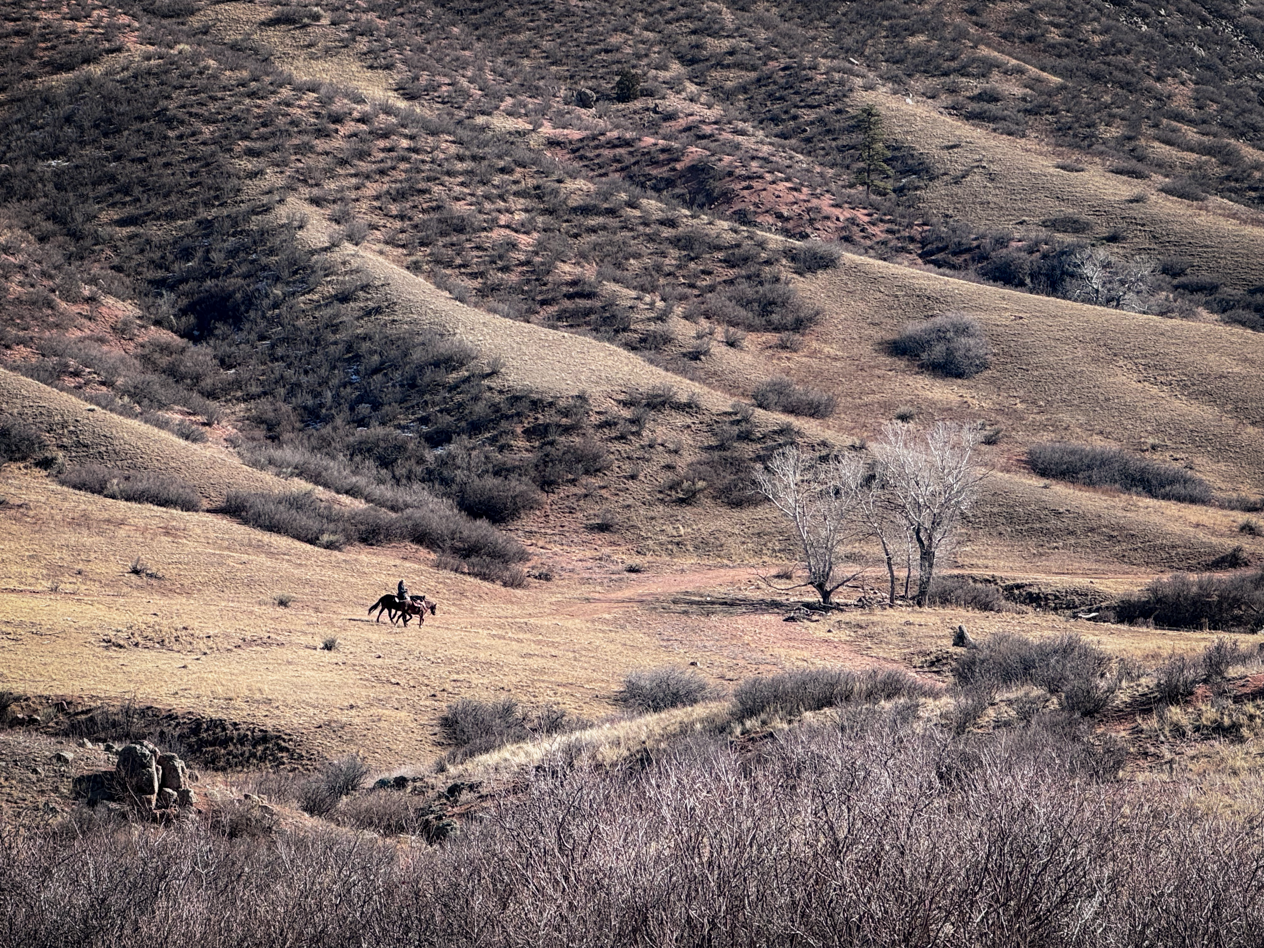 We passed cattle grazing not far from the trail, reminders that this land is still working, still lived on. Later, we watched a rider on horseback move quietly across the valley — a moment that felt timeless, echoing the land’s long ranching past.